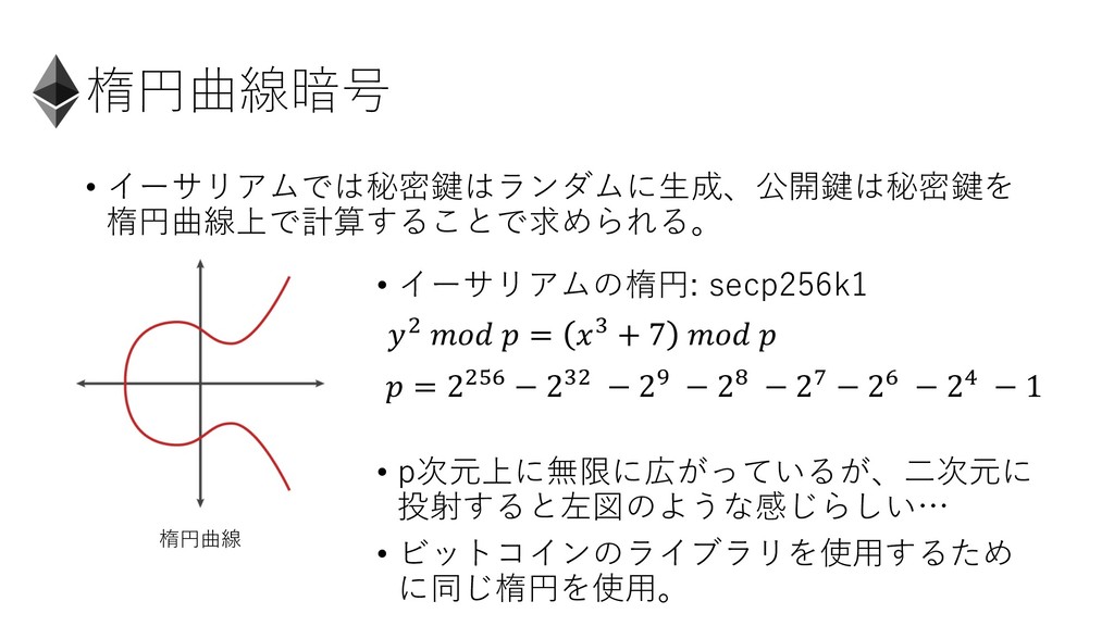 楕円曲線暗号 • イーサリアムでは秘密鍵はランダムに⽣成、公開鍵は秘密鍵を 楕円曲線上で計算することで求められる。 楕円曲線 • イーサリアムの楕円: secp256k1 • p次元上に無限に広がっているが、⼆次元に