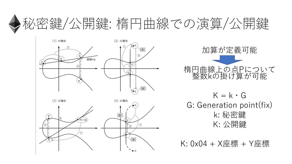 秘密鍵/公開鍵: 楕円曲線での演算/公開鍵 加算が定義可能 楕円曲線上の点Pについて 整数kの掛け算が可能 K = k・G G: Generation