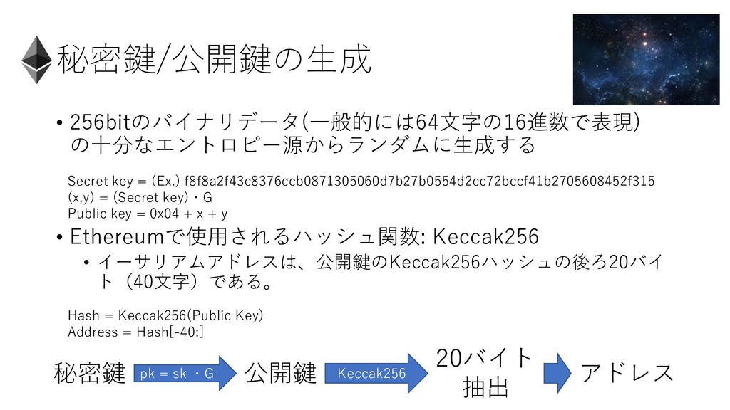 Secret key = (Ex.) f8f8a2f43c8376ccb0871305060d7b27b0554d2cc72bccf41b2705608452f315 (x,y) = (Secret key)・G Public key = 0x04 + x + y Hash = Keccak256(Public Key) Address = Hash[-40:] 公開鍵 20バイト 抽出 アドレス Keccak256 秘密鍵 pk = sk ・G