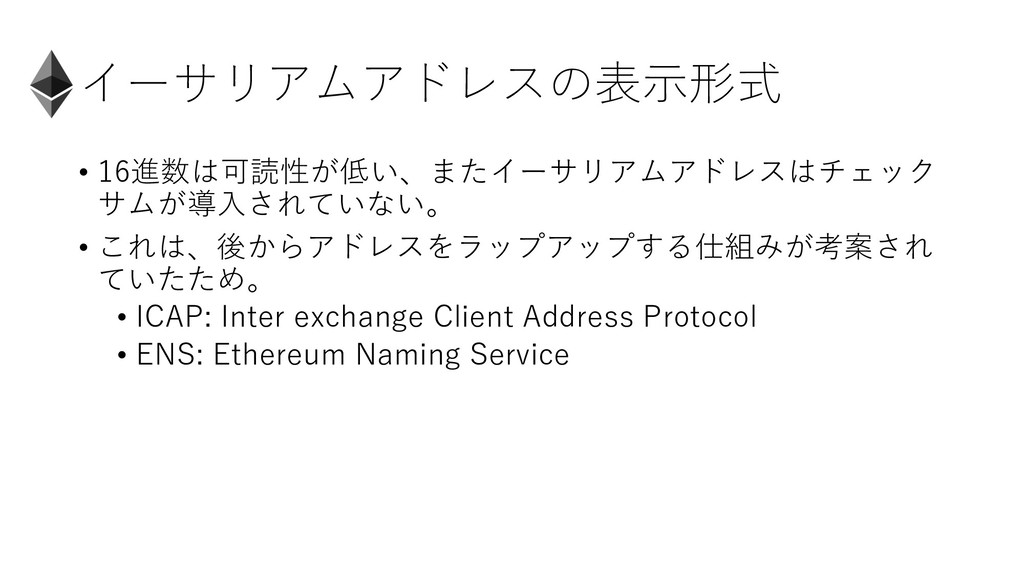 イーサリアムアドレスの表⽰形式 • 16進数は可読性が低い、またイーサリアムアドレスはチェック サムが導⼊されていない。 • これは、後からアドレスをラップアップする仕組みが考案され ていたため。 • ICAP: Inter