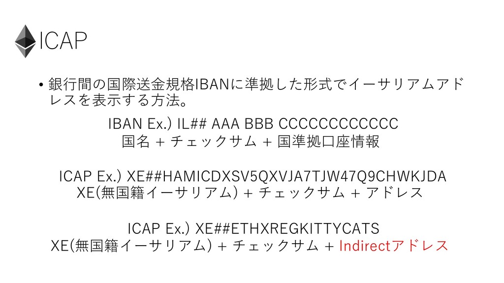 ICAP • 銀⾏間の国際送⾦規格IBANに準拠した形式でイーサリアムアド レスを表⽰する⽅法。 IBAN Ex. IL## AAA BBB CCCCCCCCCCCC