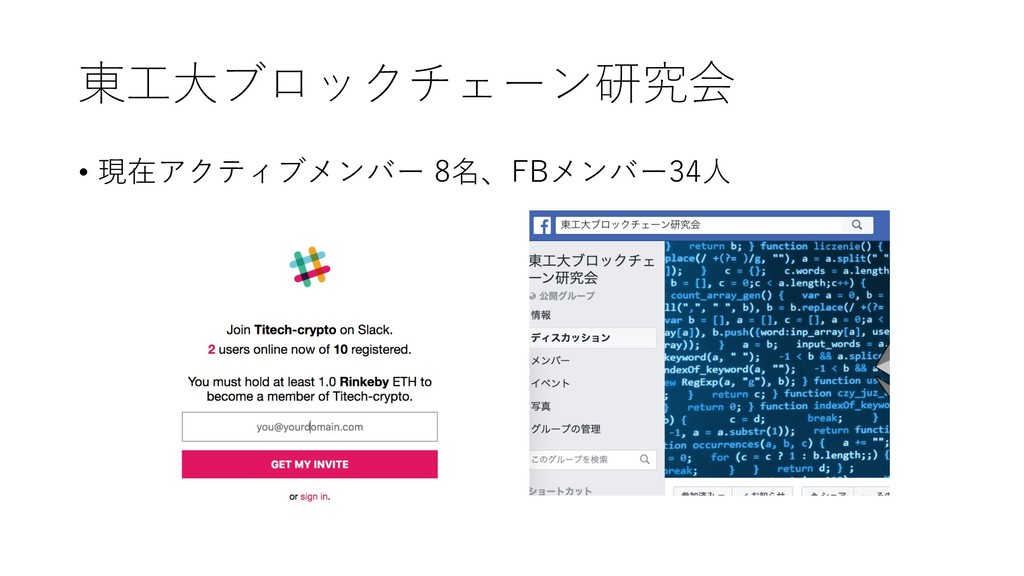 • 現在アクティブメンバー 8名、FBメンバー34⼈ 東⼯⼤ブロックチェーン研究会