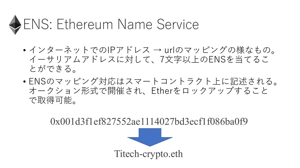 ENS: Ethereum Name Service • インターネットでのIPアドレス → urlのマッピングの様なもの。 イーサリアムアドレスに対して、7⽂字以上のENSを当てるこ とができる。