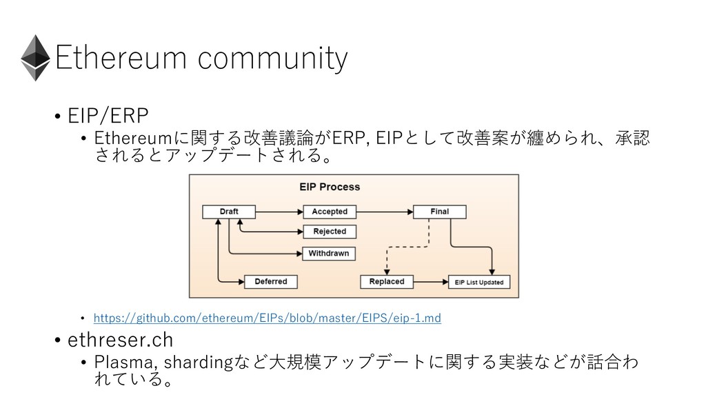 Ethereum community • EIP/ERP • Ethereumに関する改善議論がERP, EIPとして改善案が纏められ、承認 されるとアップデートされる。 • https://github.com/ethereum/EIPs/blob/master/EIPS/eip-1.md
