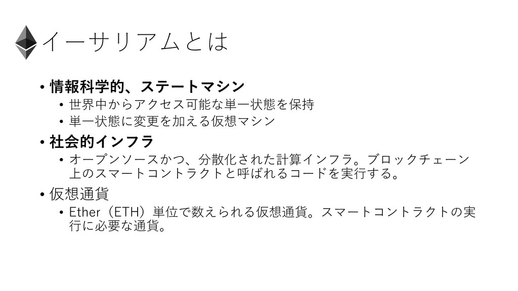 オープンソースかつ、分散化された計算インフラ。ブロックチェーン 上のスマートコントラクトと呼ばれるコードを実⾏する。 • 仮想通貨 • Ether(ETH)単位で数えられる仮想通貨。スマートコントラクトの実 ⾏に必要な通貨。