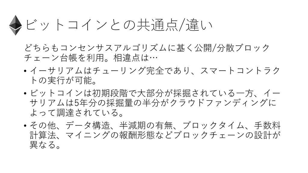 ビットコインとの共通点/違い どちらもコンセンサスアルゴリズムに基く公開/分散ブロック チェーン台帳を利⽤。相違点は… • イーサリアムはチューリング完全であり、スマートコントラク トの実⾏が可能。 • ビットコインは初期段階で⼤部分が採掘されている⼀⽅、イー サリアムは5年分の採掘量の半分がクラウドファンディングに よって調達されている。
