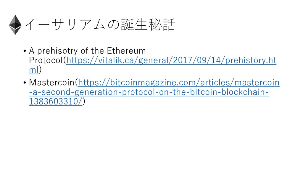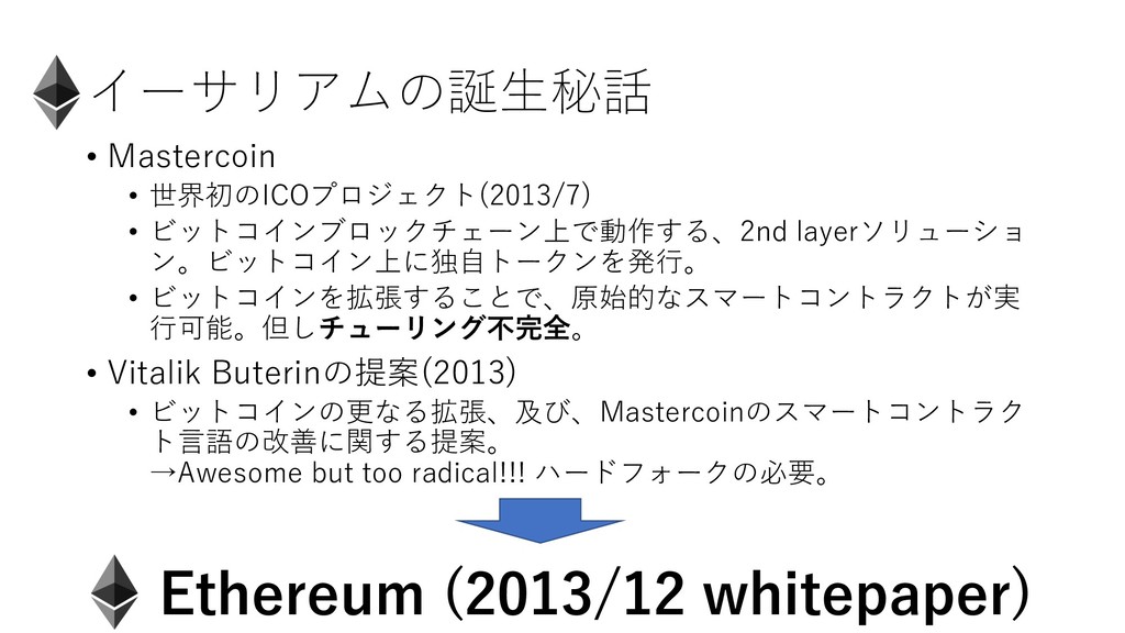 イーサリアムの誕⽣秘話 • Mastercoin • 世界初のICOプロジェクト(2013/7) • ビットコインブロックチェーン上で動作する、2nd layerソリューショ ン。ビットコイン上に独⾃トークンを発⾏。 •