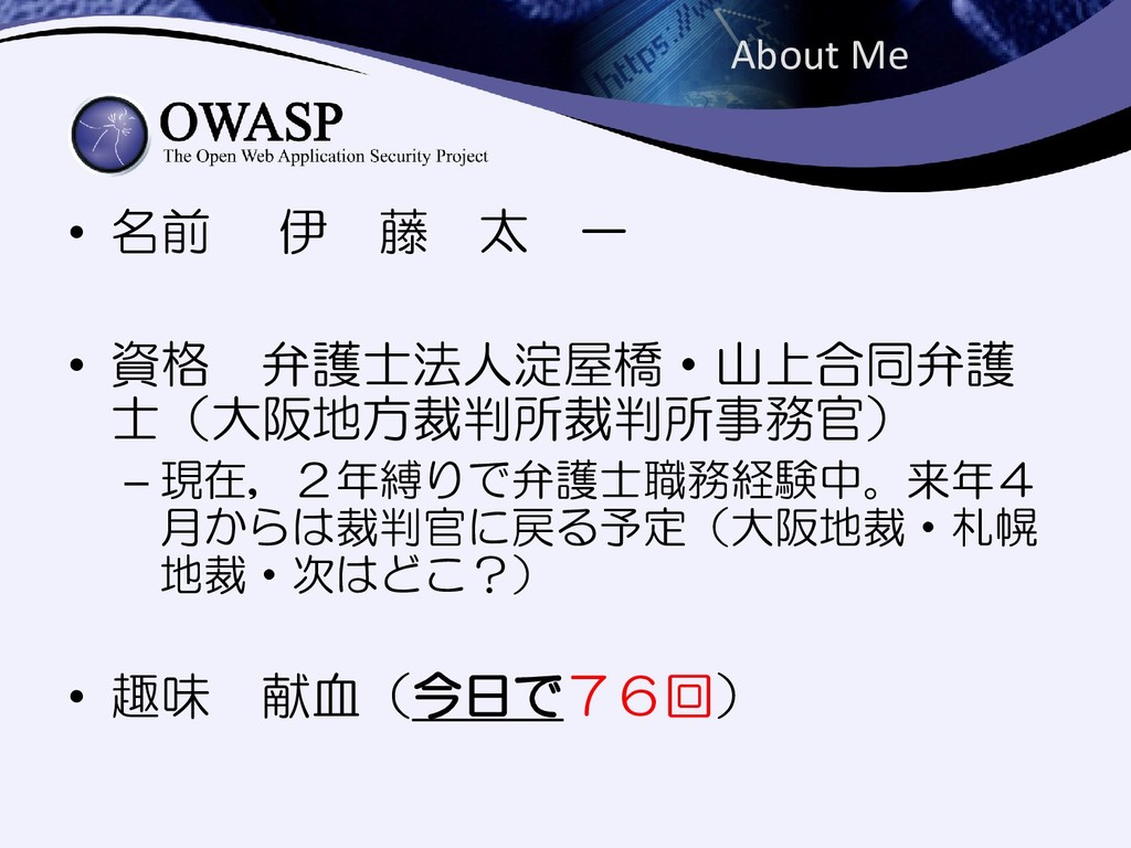 About Me • 法的判断のインパクト – 裁判所が法律以外の分野で「これ違法」と 言っちゃう→言わざるを得ないときがある – 業界大パニック?パニックになっている間に 後続訴訟→波及効