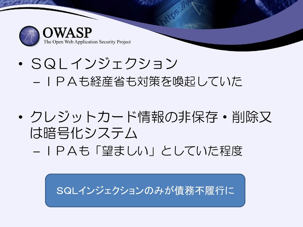 • SQLインジェクション – IPAも経産省も対策を喚起していた • クレジットカード情報の非保存・削除又 は暗号化システム – IPAも「望ましい」としていた程度 SQLインジェクションのみが債務不履行に