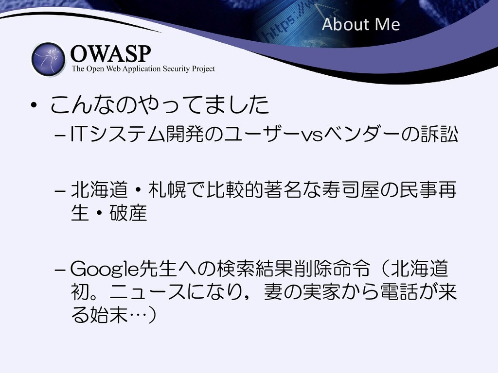 About Me • こんなのやってました – ITシステム開発のユーザーvsベンダーの訴訟 – 北海道・札幌で比較的著名な寿司屋の民事再 生・破産 –