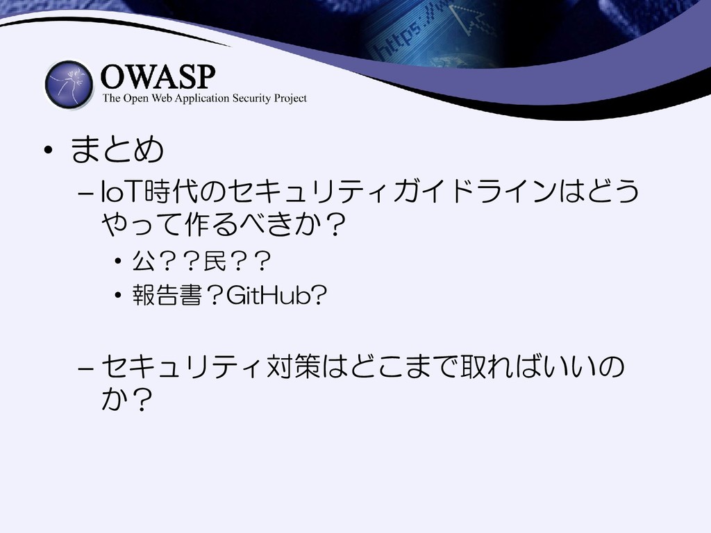 • まとめ – IoT時代のセキュリティガイドラインはどう やって作るべきか? • 公??民?? • 報告書?GitHub? –