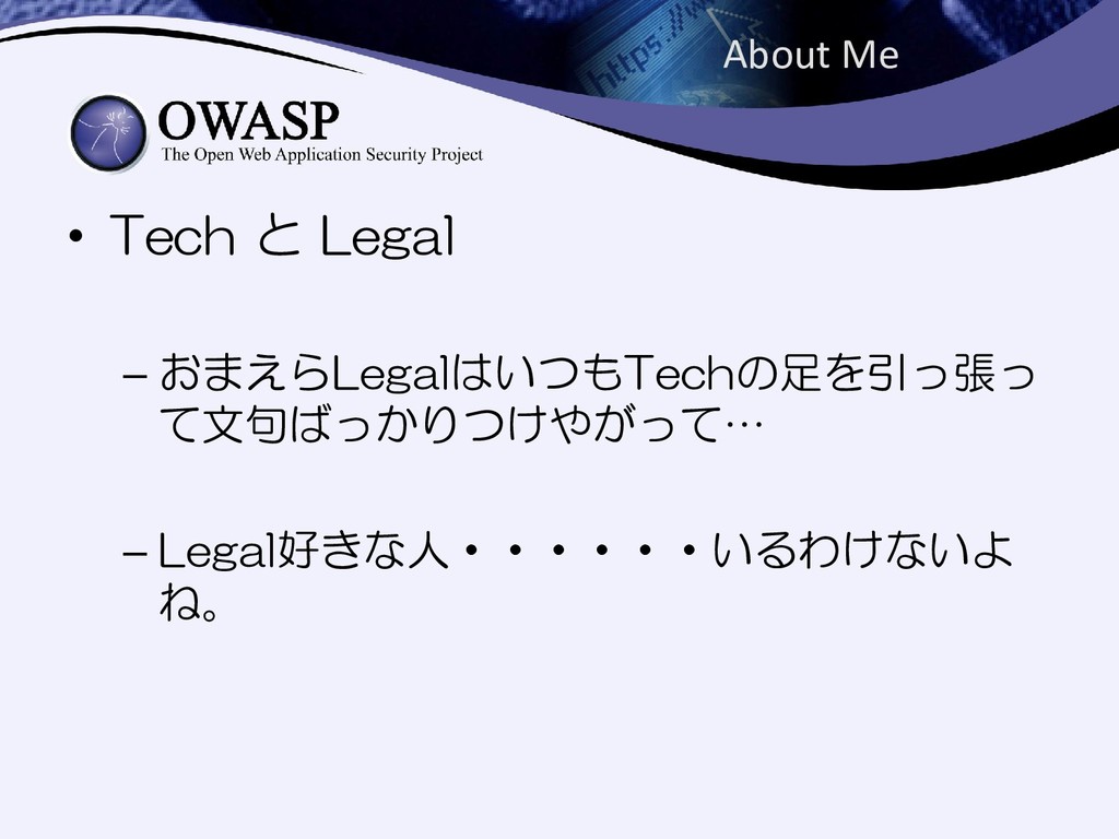 About Me • Tech と Legal – おまえらLegalはいつもTechの足を引っ張っ て文句ばっかりつけやがって… –