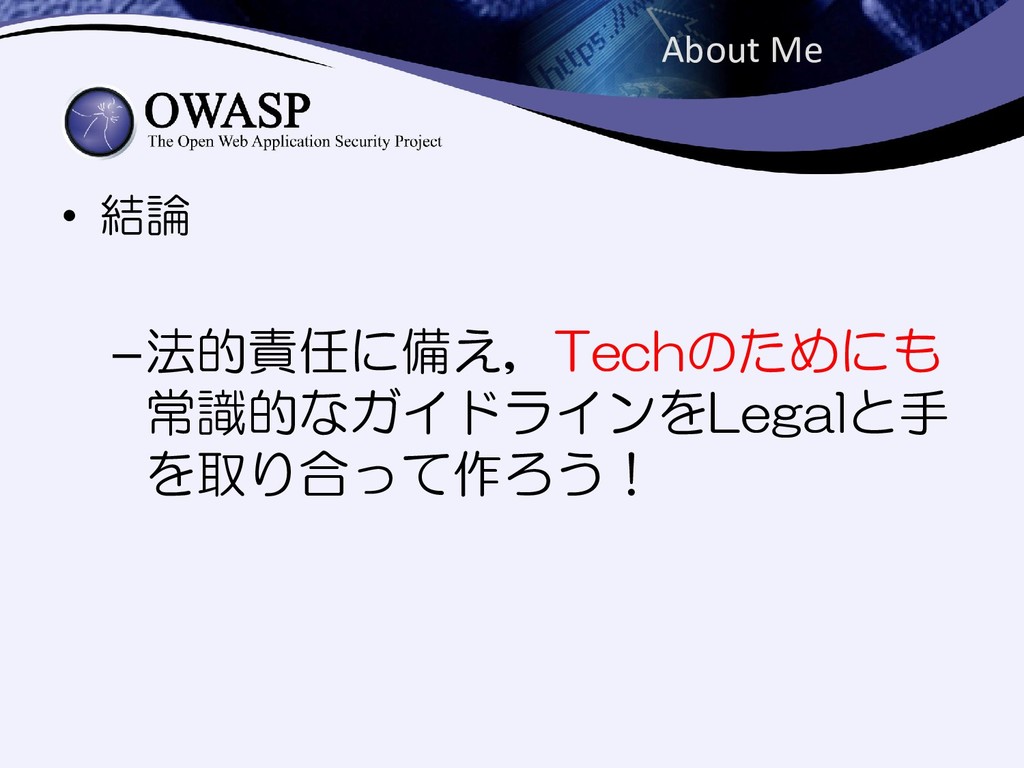 About Me • 結論 –法的責任に備え,Techのためにも 常識的なガイドラインをLegalと手 を取り合って作ろう!