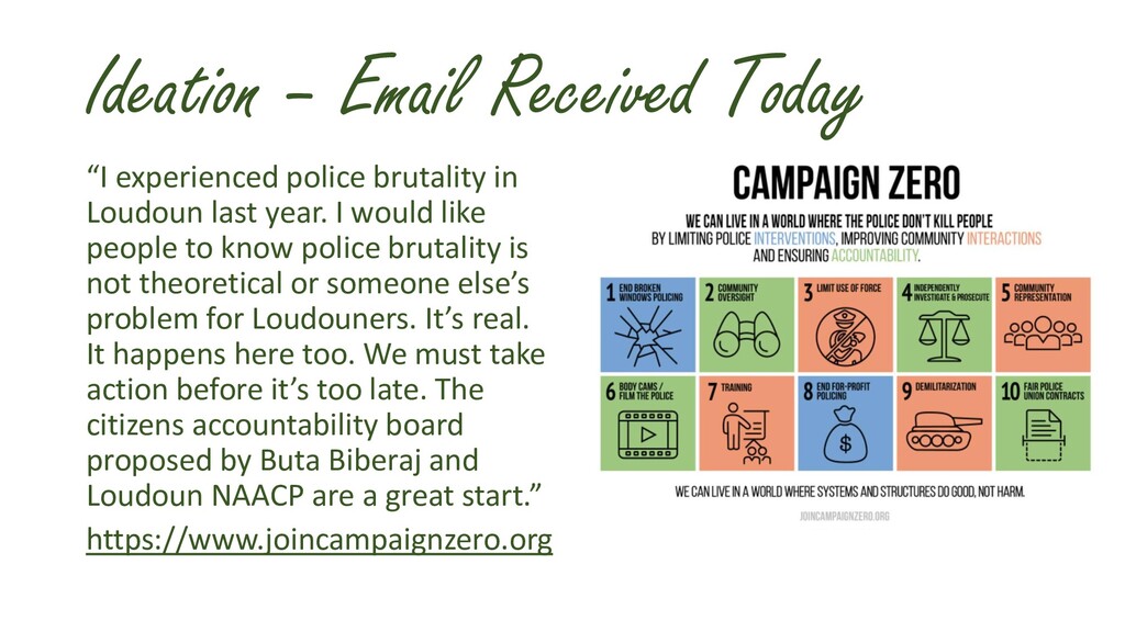 Loudoun last year. I would like people to know police brutality is not theoretical or someone else’s problem for Loudouners. It’s real. It happens here too. We must take action before it’s too late. The citizens accountability board proposed by Buta Biberaj and Loudoun NAACP are a great start.” https://www.joincampaignzero.org