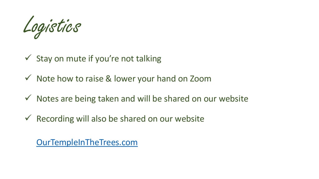 Note how to raise & lower your hand on Zoom ✓ Notes are being taken and will be shared on our website ✓ Recording will also be shared on our website OurTempleInTheTrees.com
