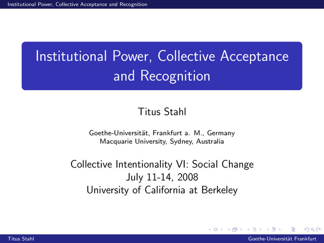 II Collective acceptance can be described as mutual attribution of institutional power (“Every other member in the community counts as someone who is entitled to evaluate my behavior in a specific context in relation to institutional rule R”) Authority ascription is mutual and symmetric Titus Stahl Goethe-Universit¨ at Frankfurt