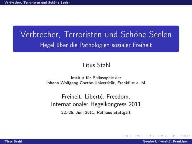 Hegel über die Pathologien sozialer Freiheit Titus Stahl Institut für Philosophie der Johann Wolfgang Goethe-Universität, Frankfurt a. M. Freiheit. Liberté. Freedom. Internationaler Hegelkongress 2011 22.-25. Juni 2011, Rathaus Stuttgart Titus Stahl Goethe-Universität Frankfurt
