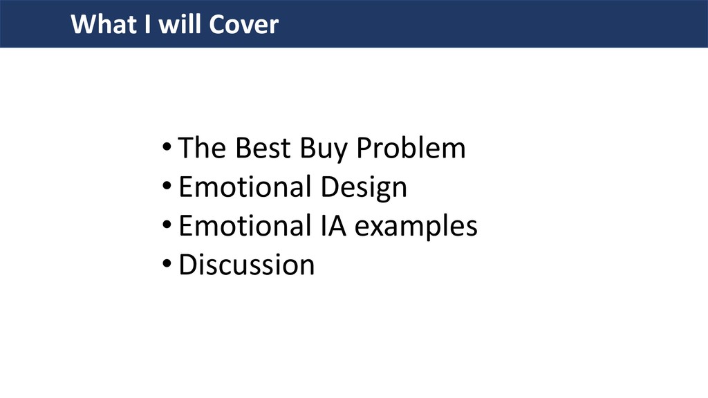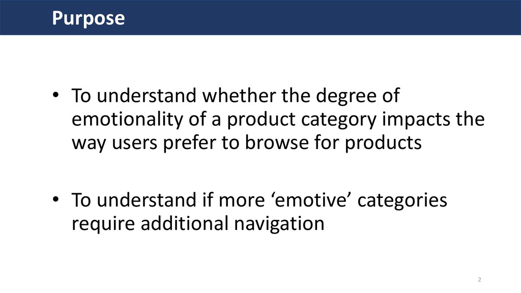 This deck focuses on understanding whether the degree of emotionality associated with a product category has an impact on the way a user prefers to browse for products and if more “emotive” categories require additional navigation that structures products in non-hierarchical groupings.