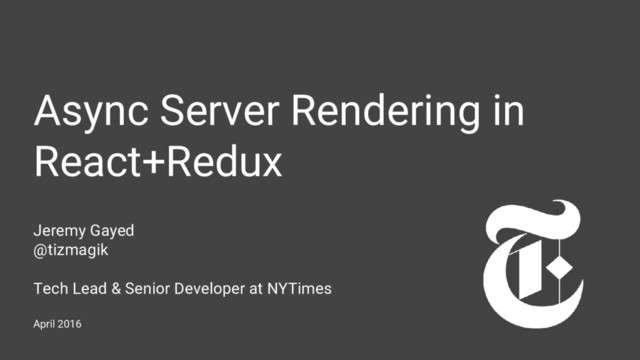 /* server.js */ // Render once to instantiate all components (at the given route) // and collect any promises that may be registered. let content = ReactDOMServer.renderToString(initialComponent); const allPromises = reduxTaxi.getAllPromises(); if (allPromises.length) { // If we have some promises, we need to delay server rendering Promise.all(allPromises).then(() => { content = ReactDOMServer.renderToString(initialComponent); res.end(content); }).catch(() => { // some error happened, respond with error page }); } else { // otherwise, we can respond immediately with our rendered app res.end(content); }