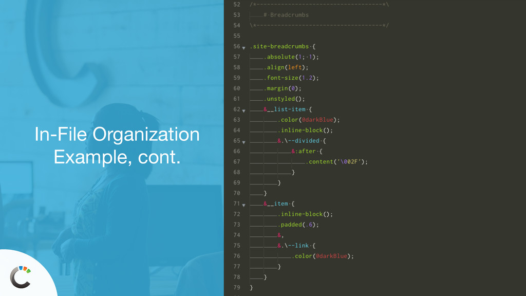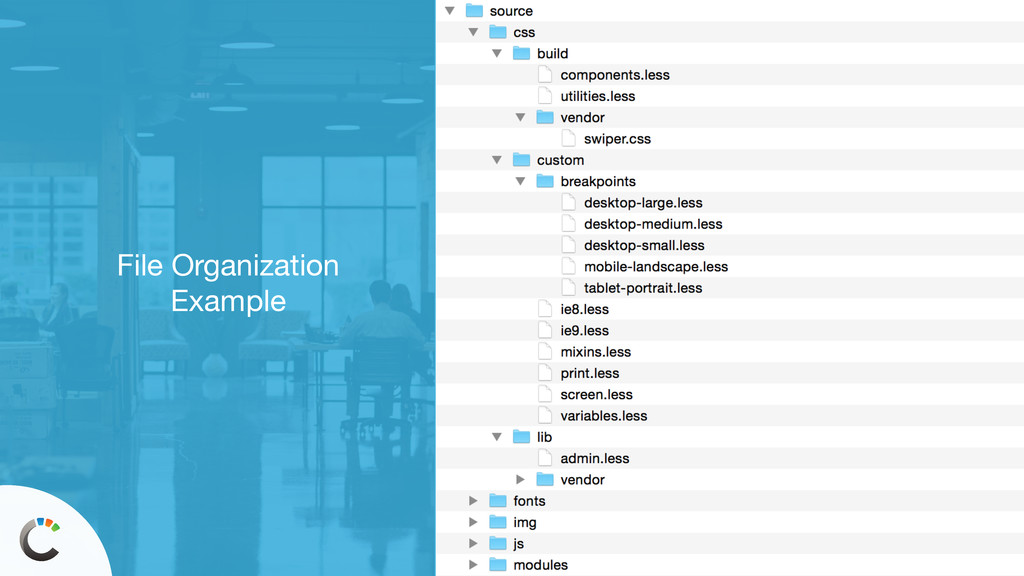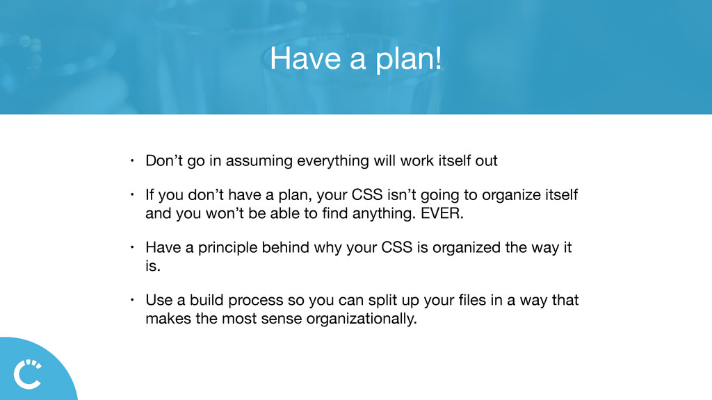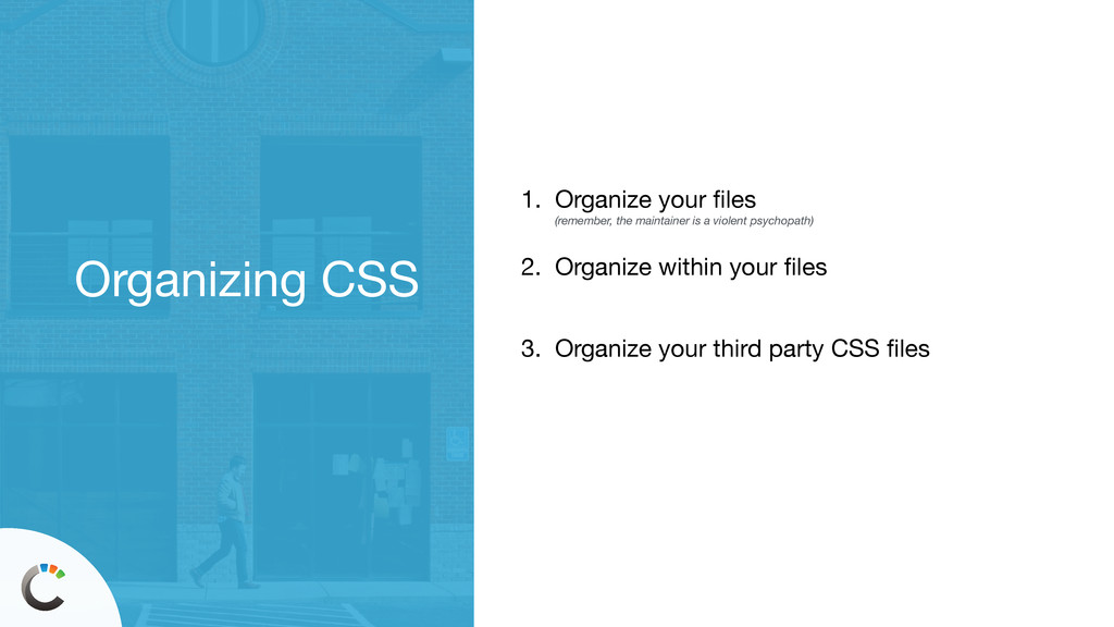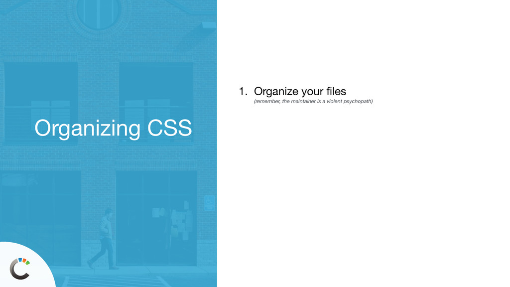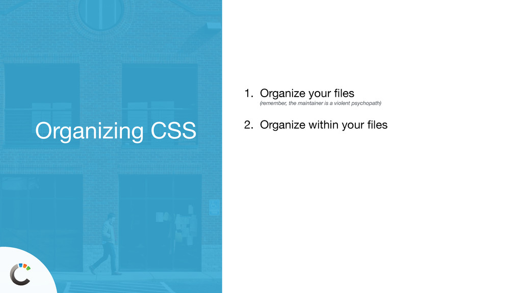 work itself out • If you don’t have a plan, your CSS isn’t going to organize itself and you won’t be able to find anything. EVER. • Have a principle behind why your CSS is organized the way it is. • Use a build process so you can split up your files in a way that makes the most sense organizationally.