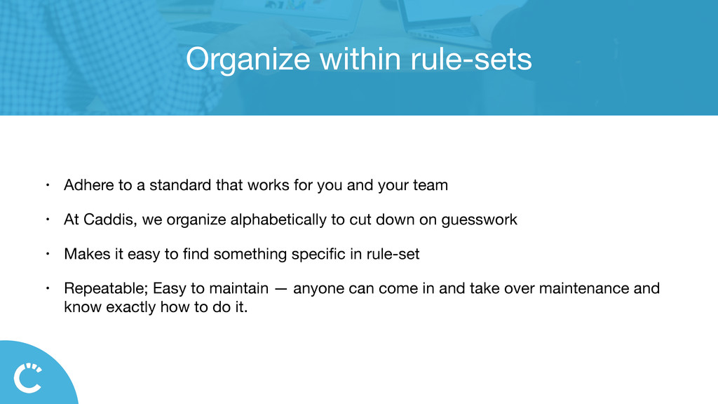 for you and your team • At Caddis, we organize alphabetically to cut down on guesswork • Makes it easy to find something specific in rule-set • Repeatable; Easy to maintain — anyone can come in and take over maintenance and know exactly how to do it.