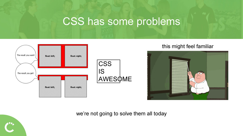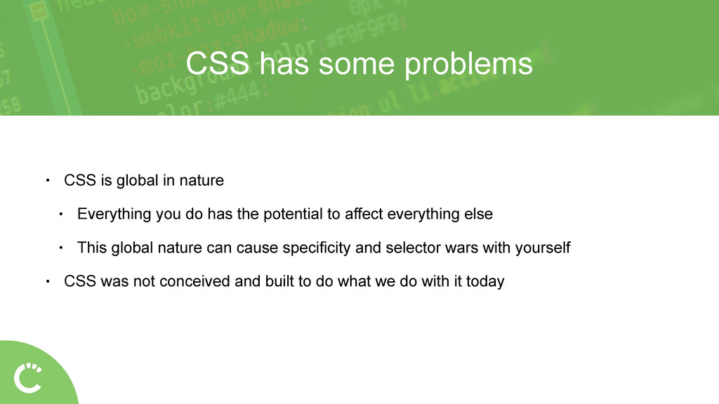 has the potential to affect everything else • This global nature can cause specificity and selector wars with yourself • CSS was not conceived and built to do what we do with it today CSS has some problems