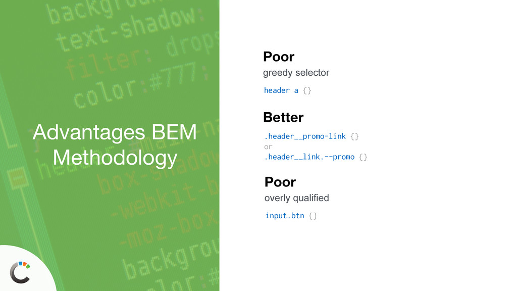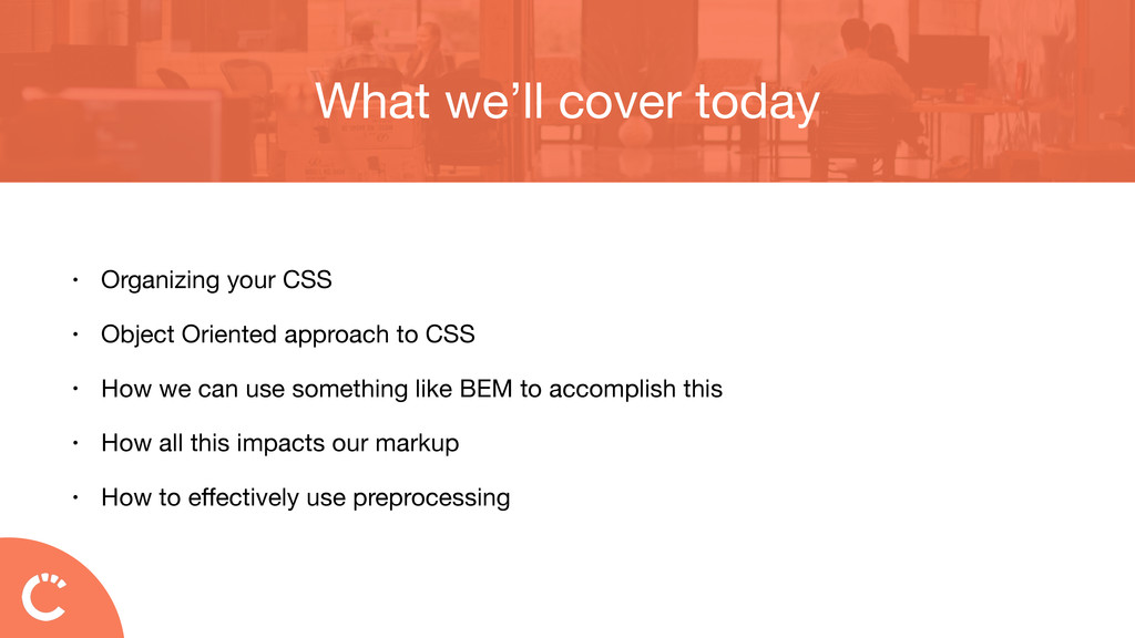 Oriented approach to CSS • How we can use something like BEM to accomplish this • How all this impacts our markup • How to effectively use preprocessing