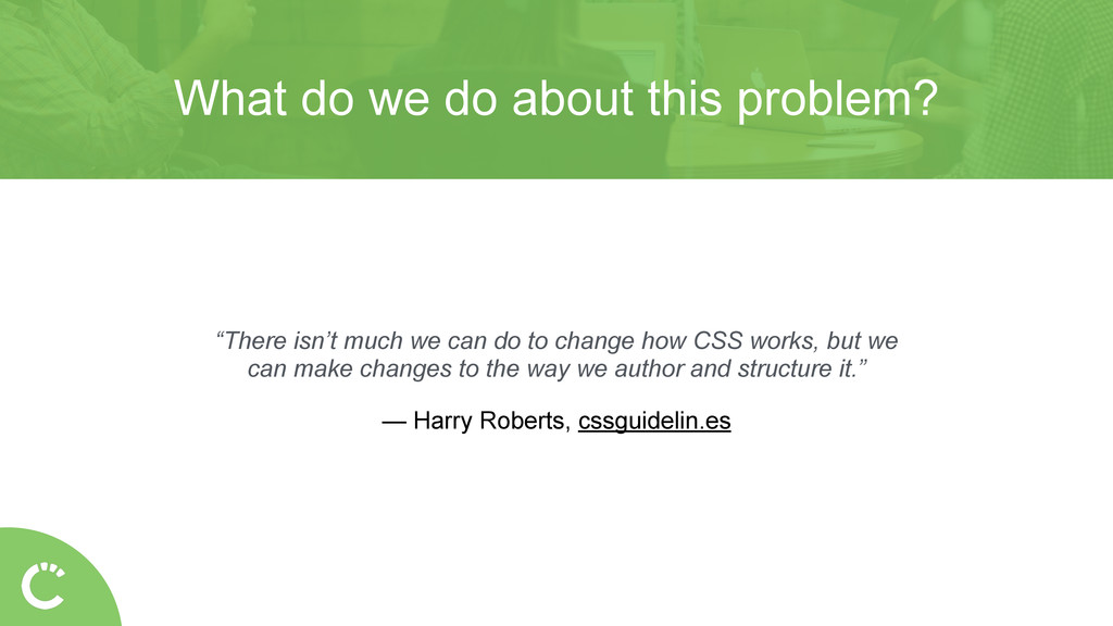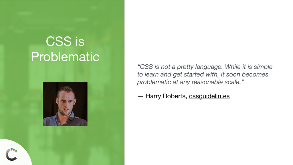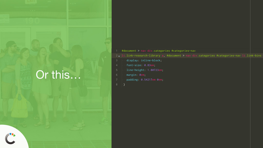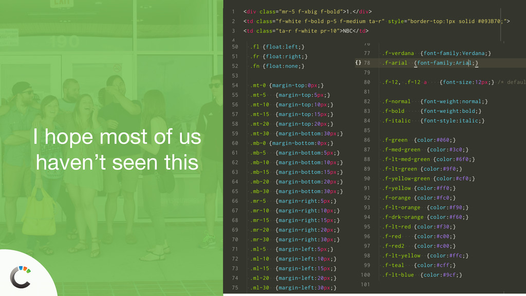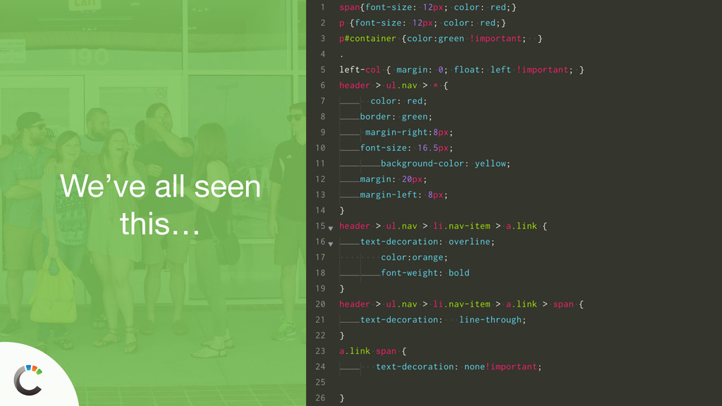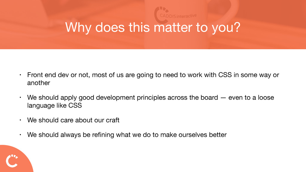 or not, most of us are going to need to work with CSS in some way or another • We should apply good development principles across the board — even to a loose language like CSS • We should care about our craft • We should always be refining what we do to make ourselves better