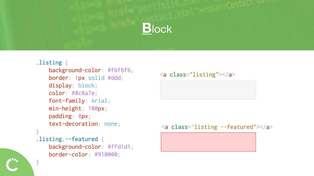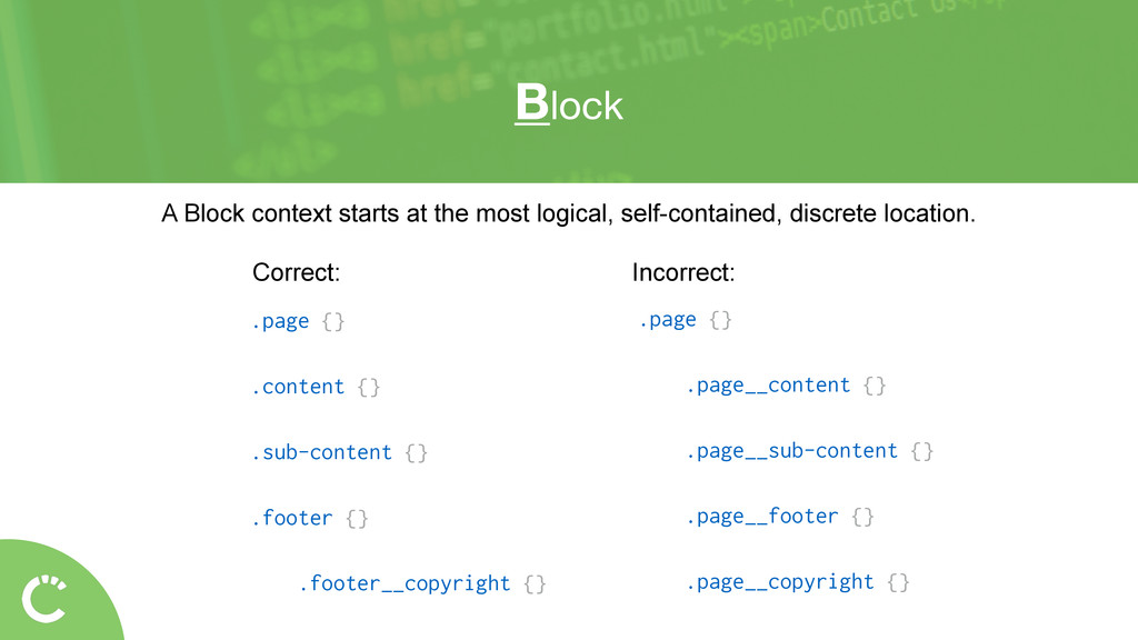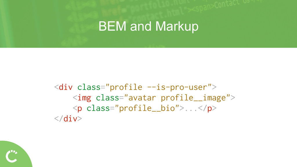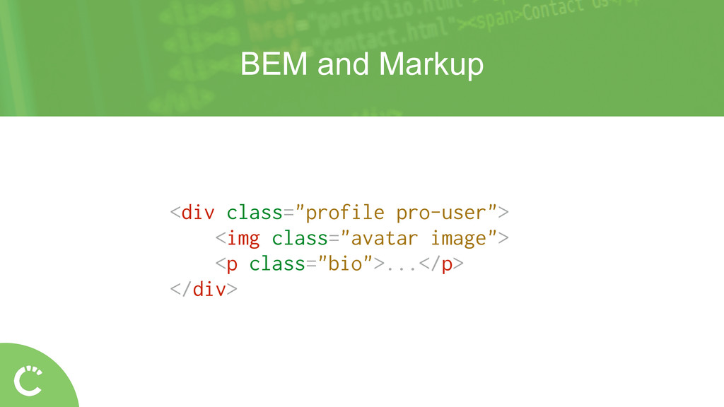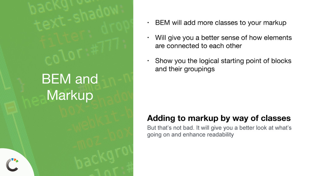your markup • Will give you a better sense of how elements are connected to each other • Show you the logical starting point of blocks and their groupings Adding to markup by way of classes But that’s not bad. It will give you a better look at what’s going on and enhance readability