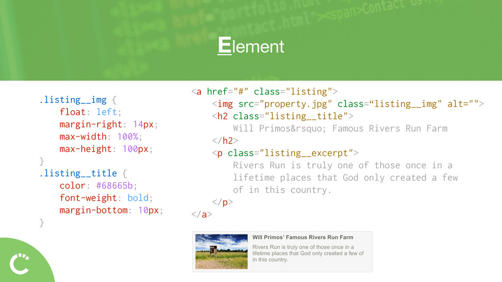 100px; } .listing__title { color: #68665b; font-weight: bold; margin-bottom: 10px; } <a href="#" class="listing"> <img src="property.jpg" class=“listing__img" alt=""> <h2 class="listing__title"> Will Primos’ Famous Rivers Run Farm </h2> <p class="listing__excerpt"> Rivers Run is truly one of those once in a lifetime places that God only created a few of in this country. </p> </a>