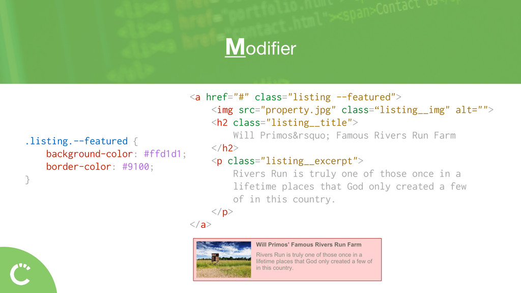 class="listing --featured"> <img src="property.jpg" class=“listing__img" alt=""> <h2 class="listing__title"> Will Primos’ Famous Rivers Run Farm </h2> <p class="listing__excerpt"> Rivers Run is truly one of those once in a lifetime places that God only created a few of in this country. </p> </a>