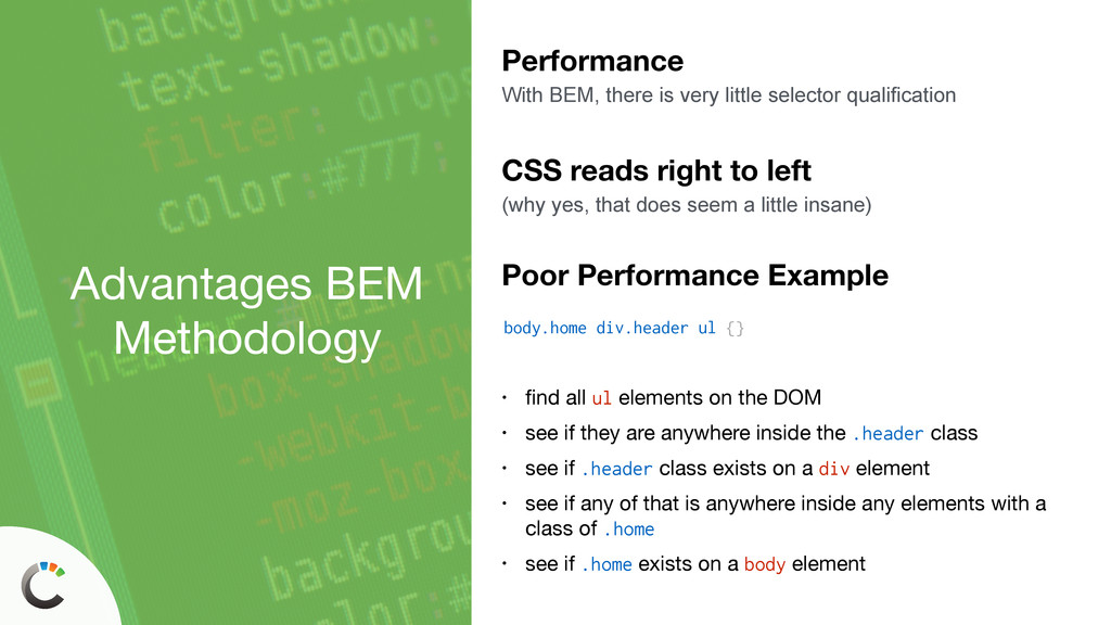 selector qualification body.home div.header ul {} Poor Performance Example • find all ul elements on the DOM • see if they are anywhere inside the .header class • see if .header class exists on a div element • see if any of that is anywhere inside any elements with a class of .home • see if .home exists on a body element CSS reads right to left (why yes, that does seem a little insane)