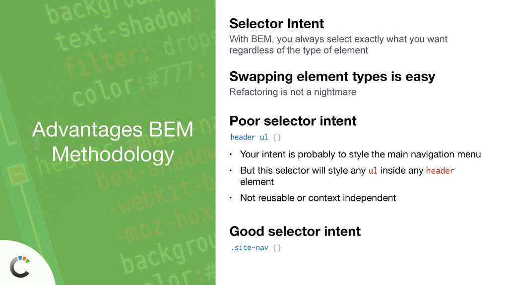 exactly what you want regardless of the type of element header ul {} Poor selector intent • Your intent is probably to style the main navigation menu • But this selector will style any ul inside any header element • Not reusable or context independent Swapping element types is easy Refactoring is not a nightmare .site-nav {} Good selector intent
