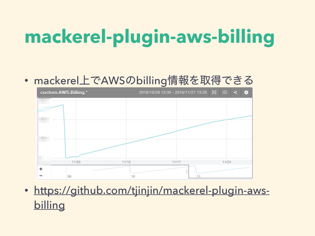 mackerel-plugin-aws-billing • mackerel্ͰAWSͷbillingใΛऔಘͰ͖Δ • https://github.com/tjinjin/mackerel-plugin-aws- billing