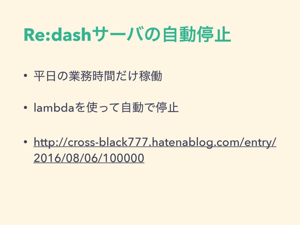 Re:dashαʔόͷࣗಈఀࢭ • ฏͷۀ͚࣌ؒͩՔಇ • lambdaΛͬͯࣗಈͰఀࢭ • http://cross-black777.hatenablog.com/entry/ 2016/08/06/100000