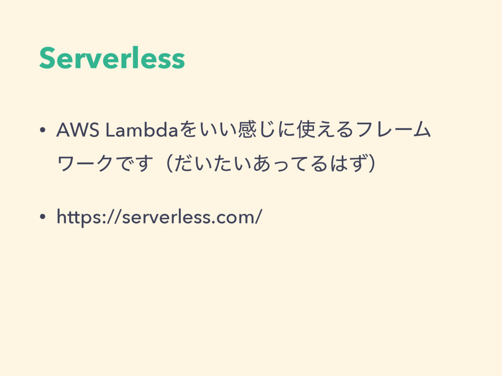Serverless • AWS LambdaΛ͍͍ײ͡ʹ͑ΔϑϨʔϜ ϫʔΫͰ͢ʢ͍͍ͩͨ͋ͬͯΔͣʣ • https://serverless.com/