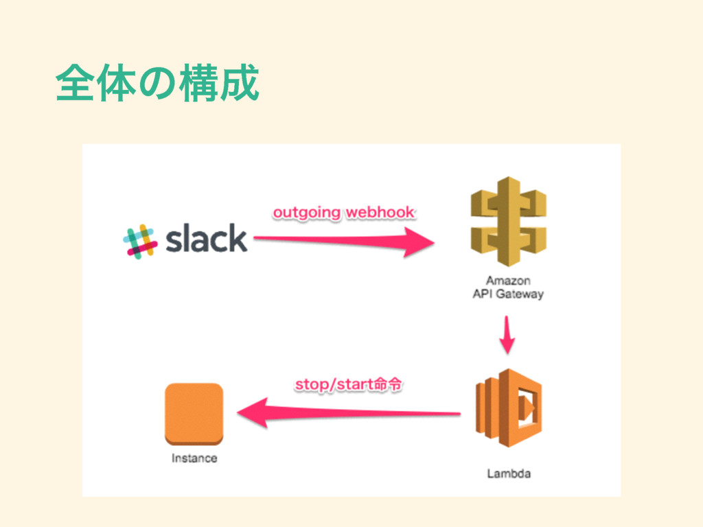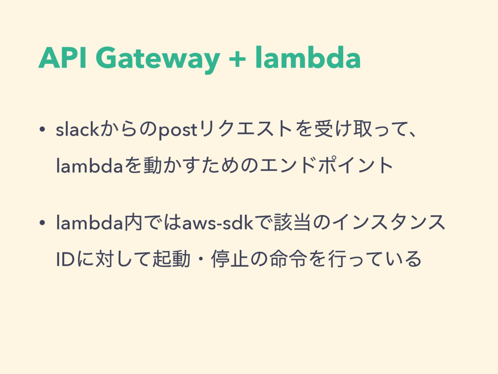 API Gateway + lambda • slack͔ΒͷpostϦΫΤετΛड͚औͬͯɺ lambdaΛಈ͔ͨ͢ΊͷΤϯυϙΠϯτ • lambdaͰaws-sdkͰ֘ͷΠϯελϯε IDʹରͯ͠ىಈɾఀࢭͷ໋ྩΛߦ͍ͬͯΔ