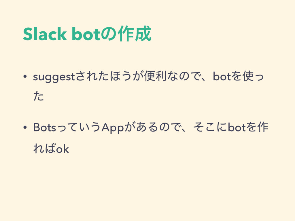 Slack botͷ࡞ • suggest͞Εͨ΄͏͕ศརͳͷͰɺbotΛͬ ͨ • Bots͍ͬͯ͏App͕͋ΔͷͰɺͦ͜ʹbotΛ࡞ Εok