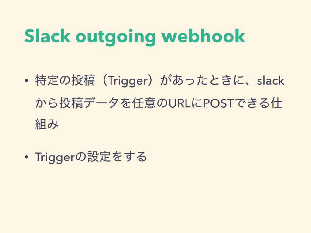 Slack outgoing webhook • ಛఆͷߘʢTriggerʣ͕͋ͬͨͱ͖ʹɺslack ͔ΒߘσʔλΛҙͷURLʹPOSTͰ͖Δ Έ • TriggerͷઃఆΛ͢Δ