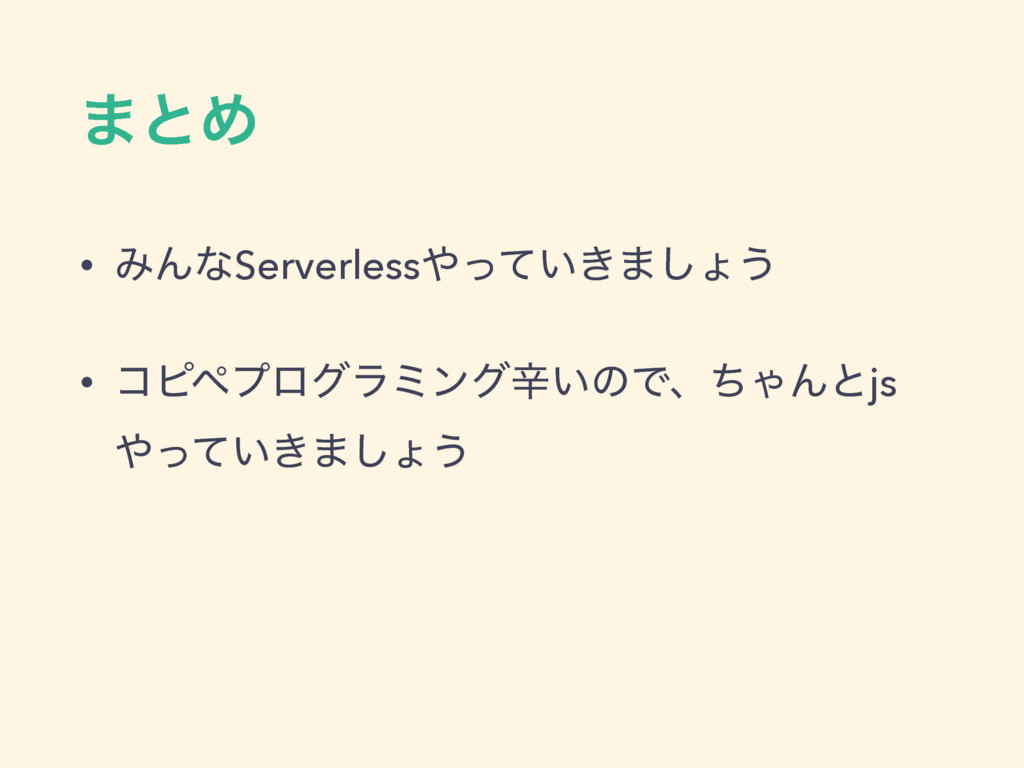 ·ͱΊ • ΈΜͳServerless͍͖ͬͯ·͠ΐ͏ • ίϐϖϓϩάϥϛϯάਏ͍ͷͰɺͪΌΜͱjs ͍͖ͬͯ·͠ΐ͏