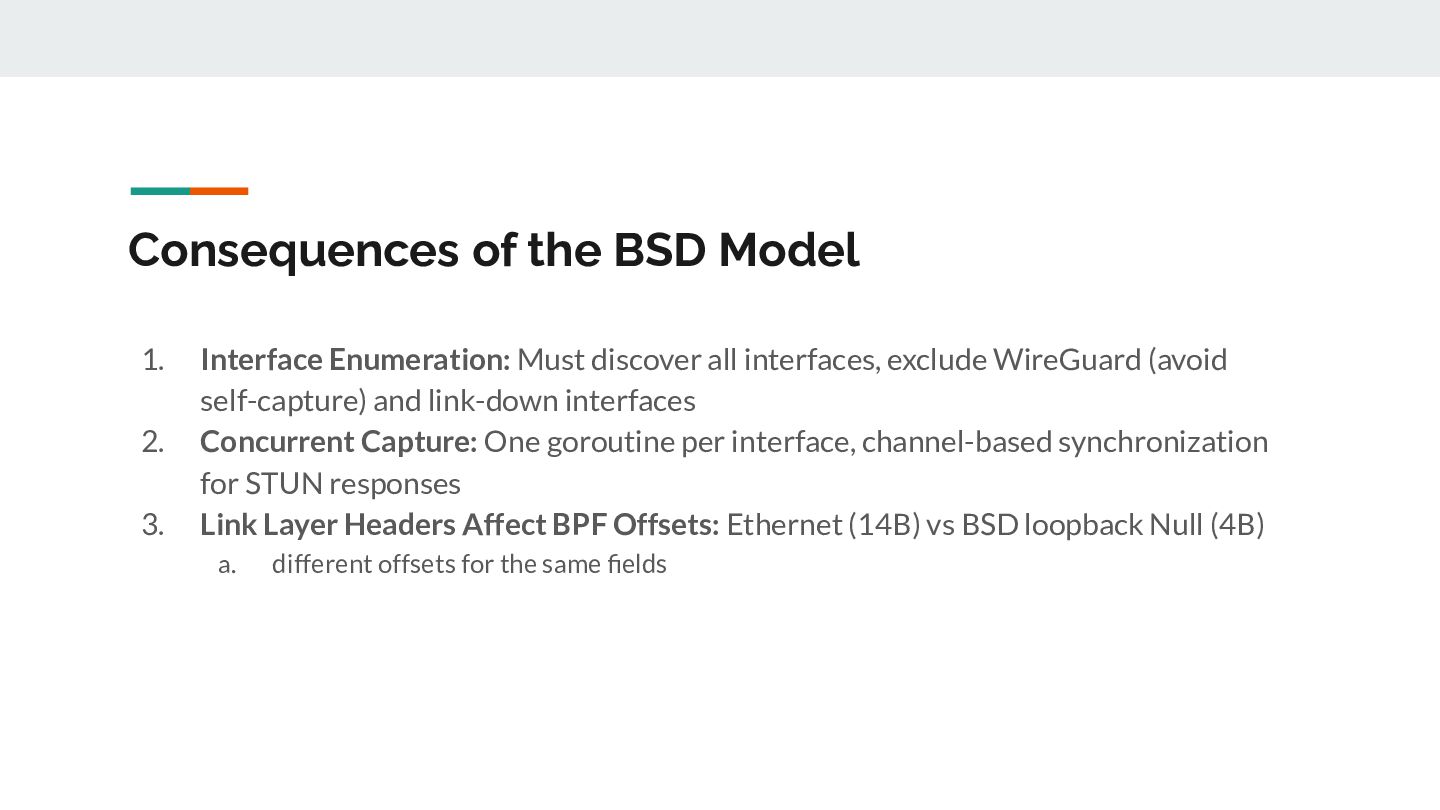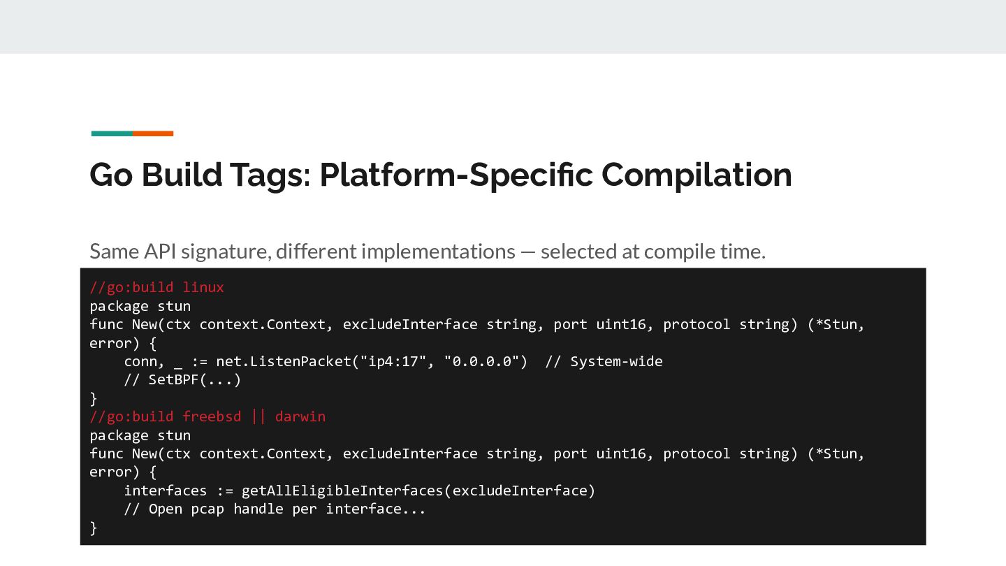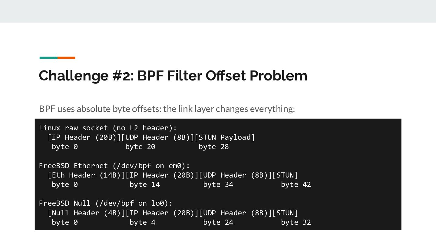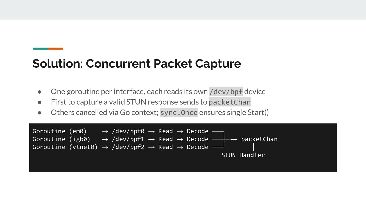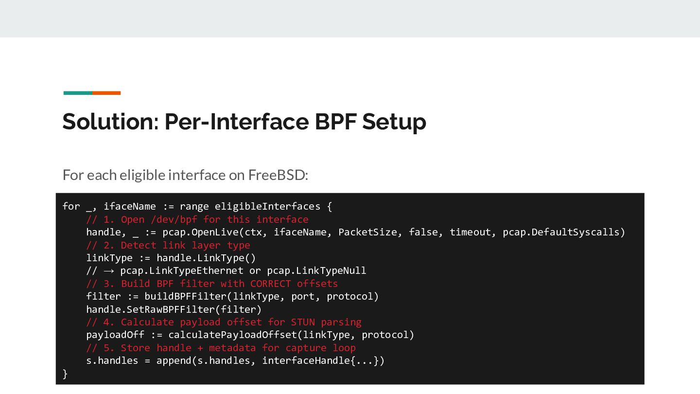 for _, ifaceName := range eligibleInterfaces { // 1. Open /dev/bpf for this interface handle, _ := pcap.OpenLive(ctx, ifaceName, PacketSize, false, timeout, pcap.DefaultSyscalls) // 2. Detect link layer type linkType := handle.LinkType() // → pcap.LinkTypeEthernet or pcap.LinkTypeNull // 3. Build BPF filter with CORRECT offsets filter := buildBPFFilter(linkType, port, protocol) handle.SetRawBPFFilter(filter) // 4. Calculate payload offset for STUN parsing payloadOff := calculatePayloadOffset(linkType, protocol) // 5. Store handle + metadata for capture loop s.handles = append(s.handles, interfaceHandle{...}) }