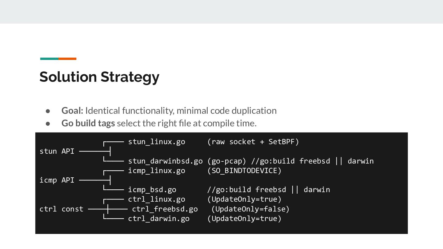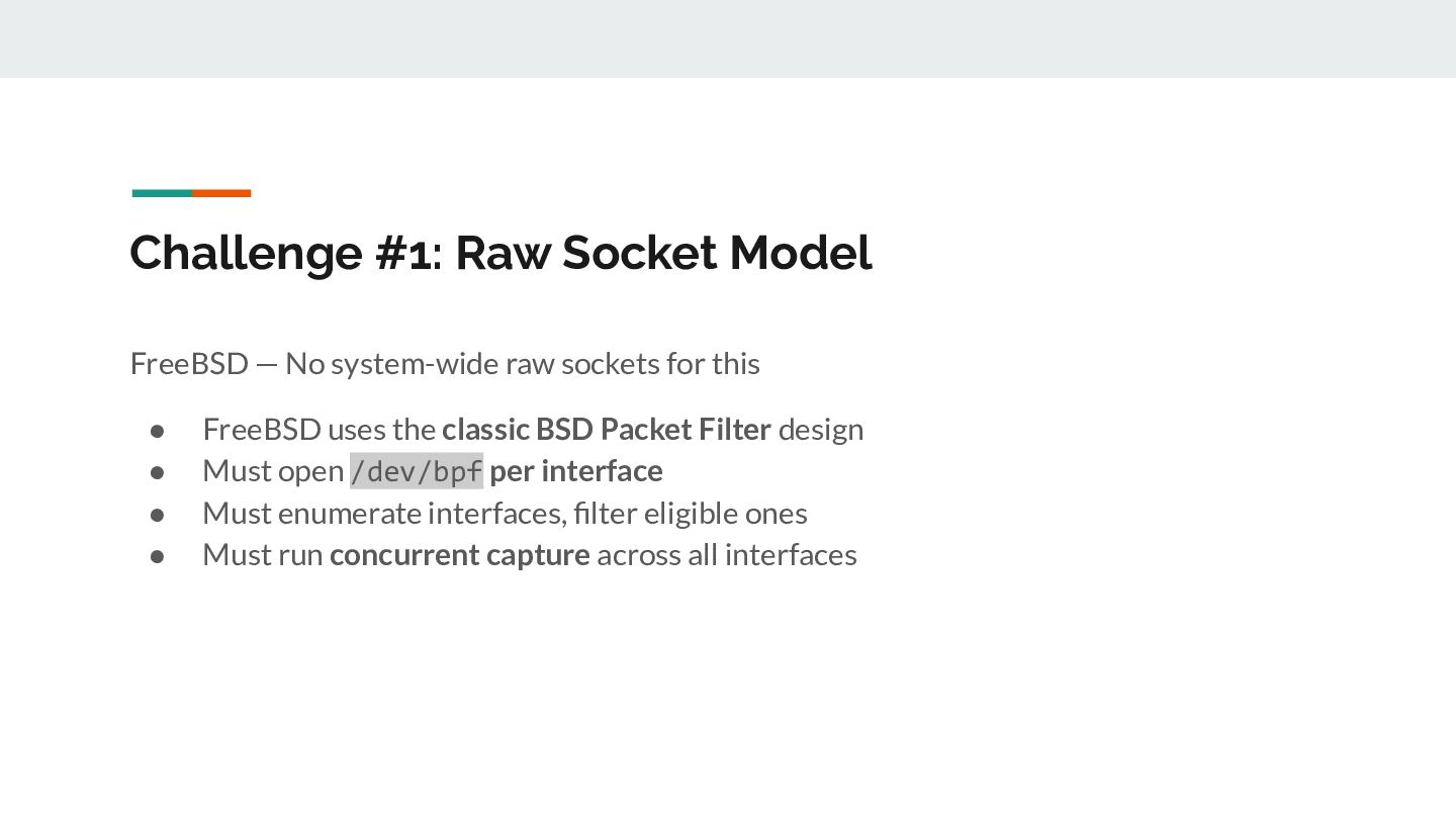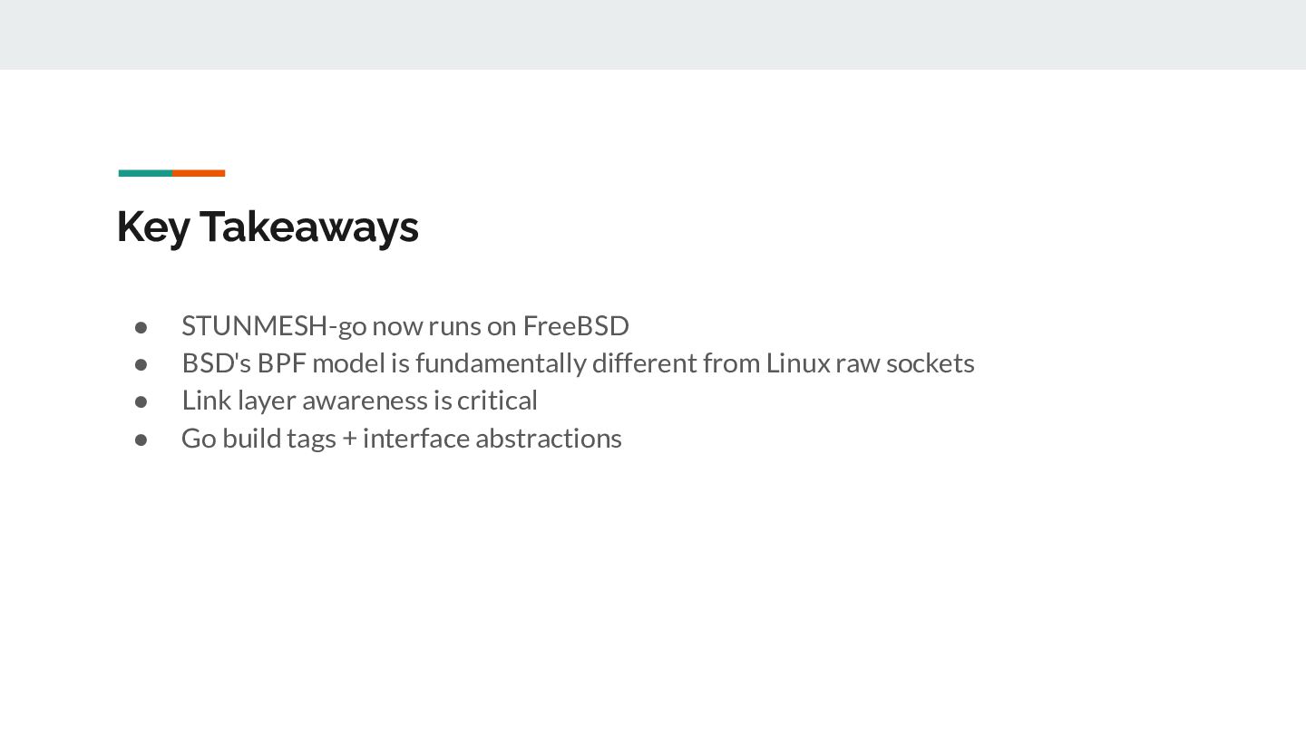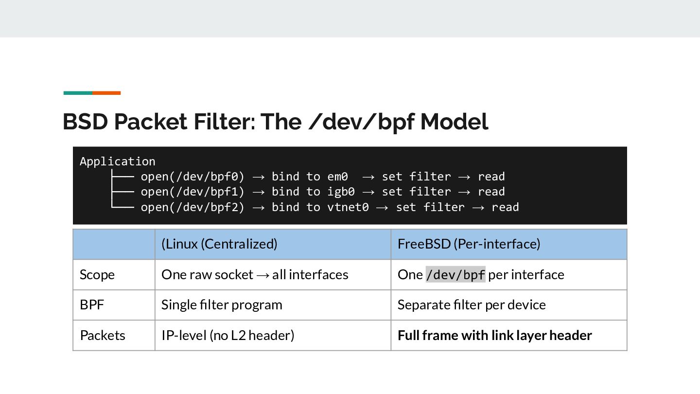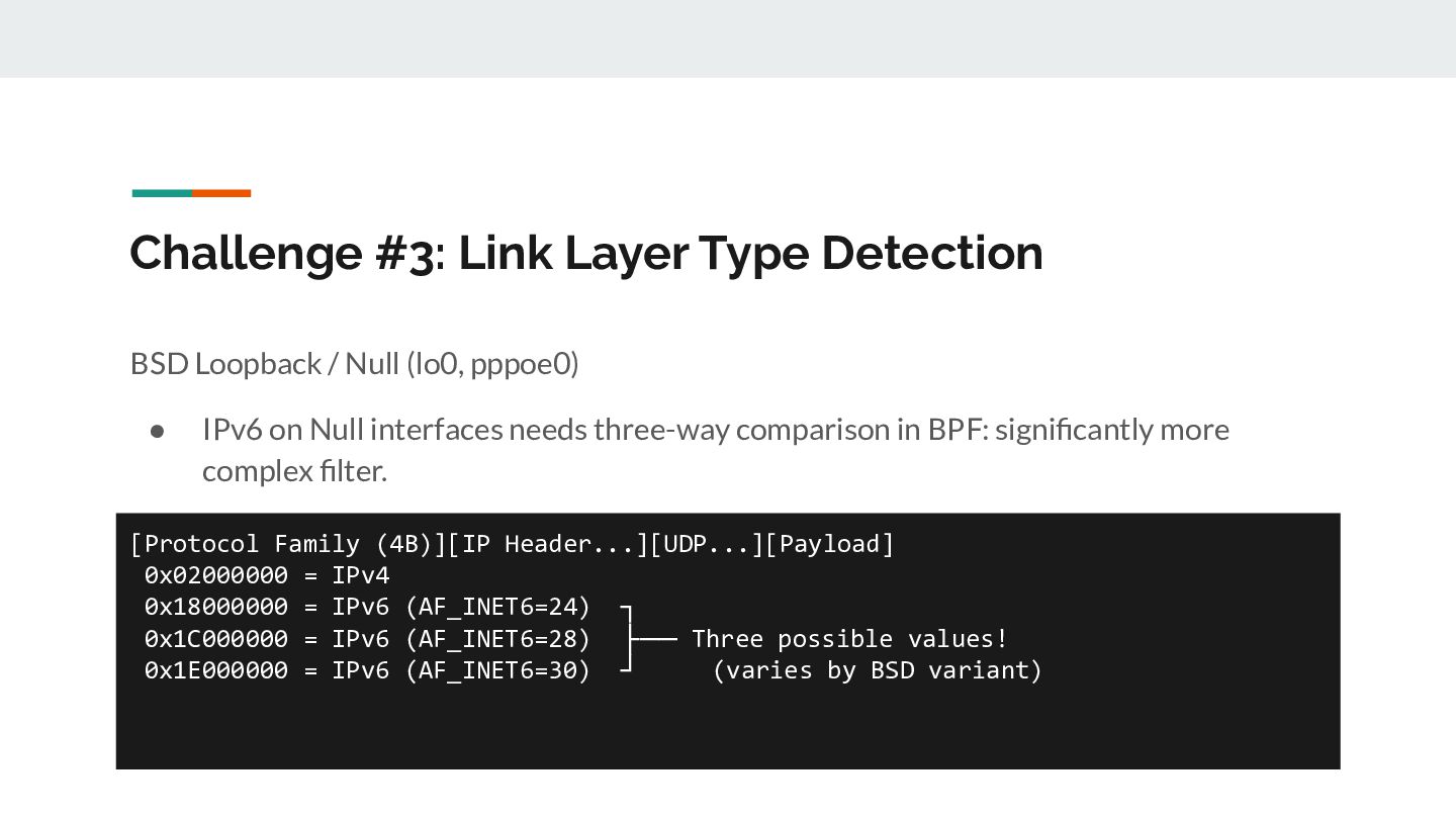 for _, ifaceName := range eligibleInterfaces { // 1. Open /dev/bpf for this interface handle, _ := pcap.OpenLive(ctx, ifaceName, PacketSize, false, timeout, pcap.DefaultSyscalls) // 2. Detect link layer type linkType := handle.LinkType() // → pcap.LinkTypeEthernet or pcap.LinkTypeNull // 3. Build BPF filter with CORRECT offsets filter := buildBPFFilter(linkType, port, protocol) handle.SetRawBPFFilter(filter) // 4. Calculate payload offset for STUN parsing payloadOff := calculatePayloadOffset(linkType, protocol) // 5. Store handle + metadata for capture loop s.handles = append(s.handles, interfaceHandle{...}) }