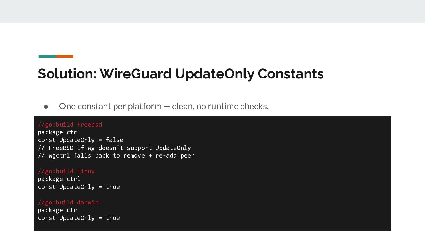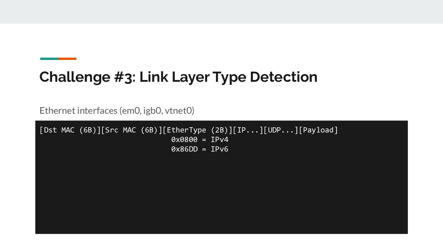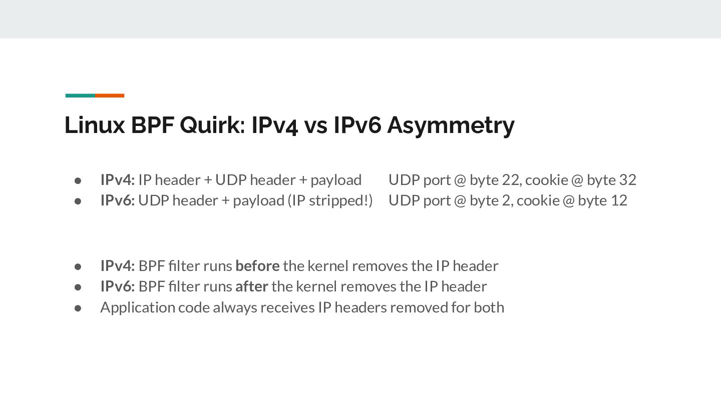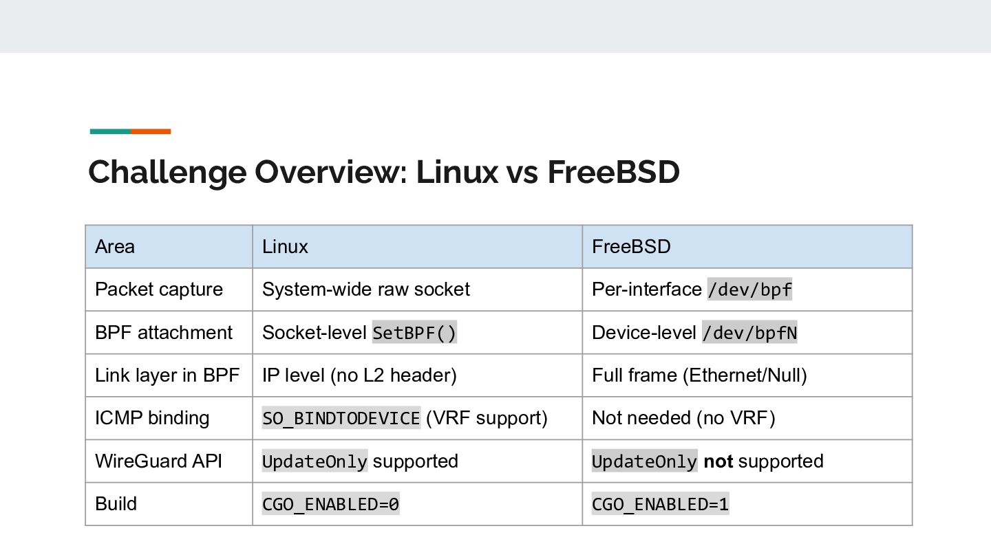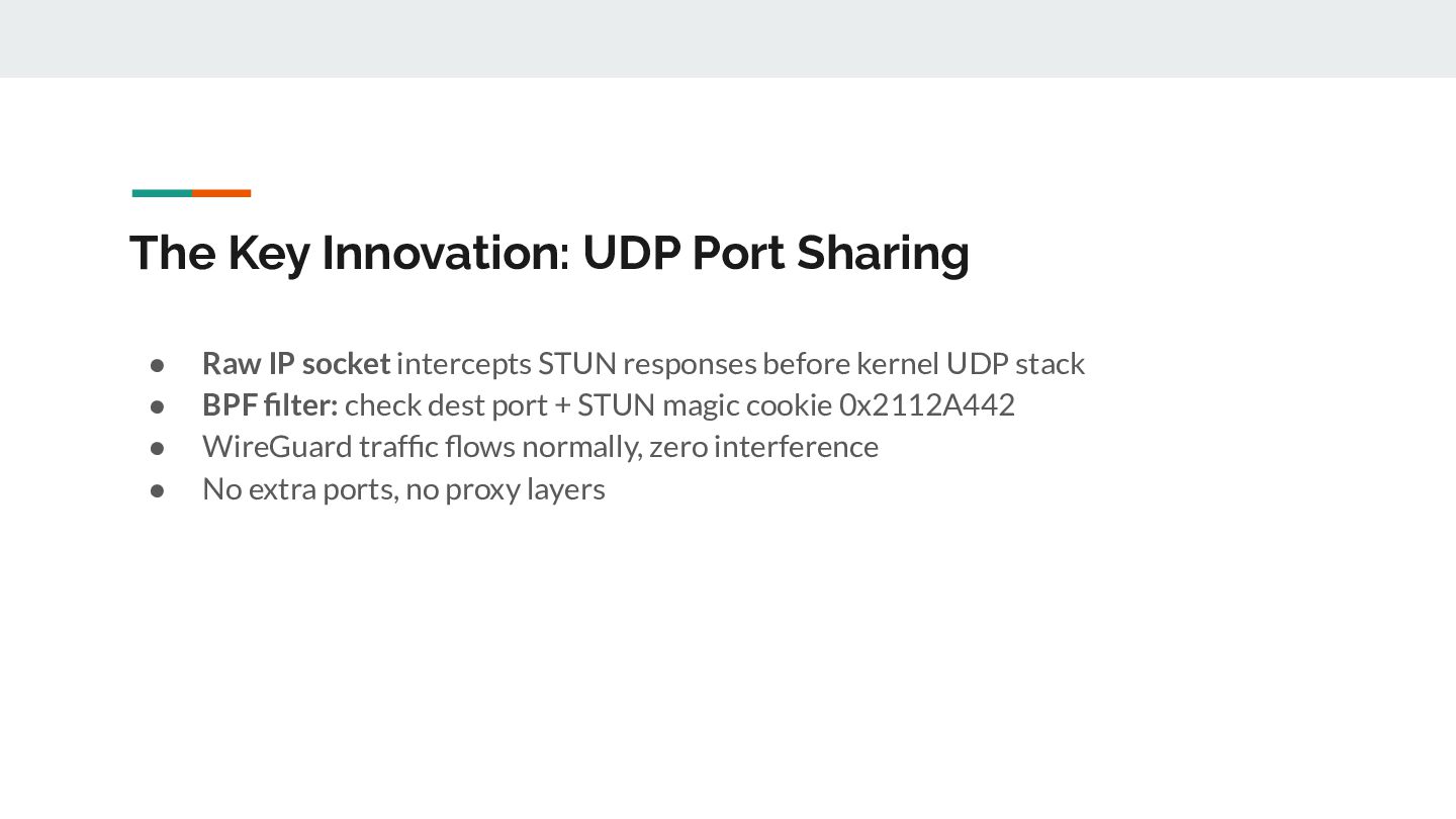 for _, ifaceName := range eligibleInterfaces { // 1. Open /dev/bpf for this interface handle, _ := pcap.OpenLive(ctx, ifaceName, PacketSize, false, timeout, pcap.DefaultSyscalls) // 2. Detect link layer type linkType := handle.LinkType() // → pcap.LinkTypeEthernet or pcap.LinkTypeNull // 3. Build BPF filter with CORRECT offsets filter := buildBPFFilter(linkType, port, protocol) handle.SetRawBPFFilter(filter) // 4. Calculate payload offset for STUN parsing payloadOff := calculatePayloadOffset(linkType, protocol) // 5. Store handle + metadata for capture loop s.handles = append(s.handles, interfaceHandle{...}) }