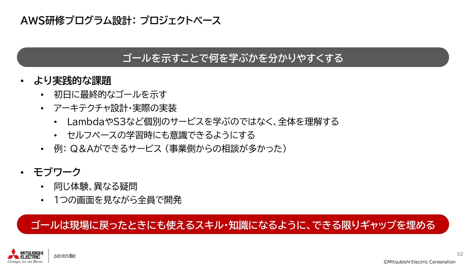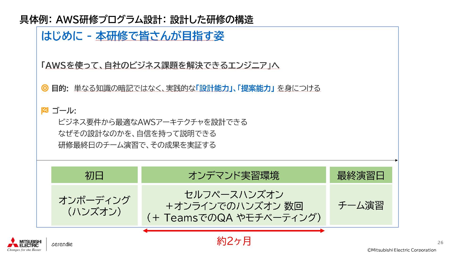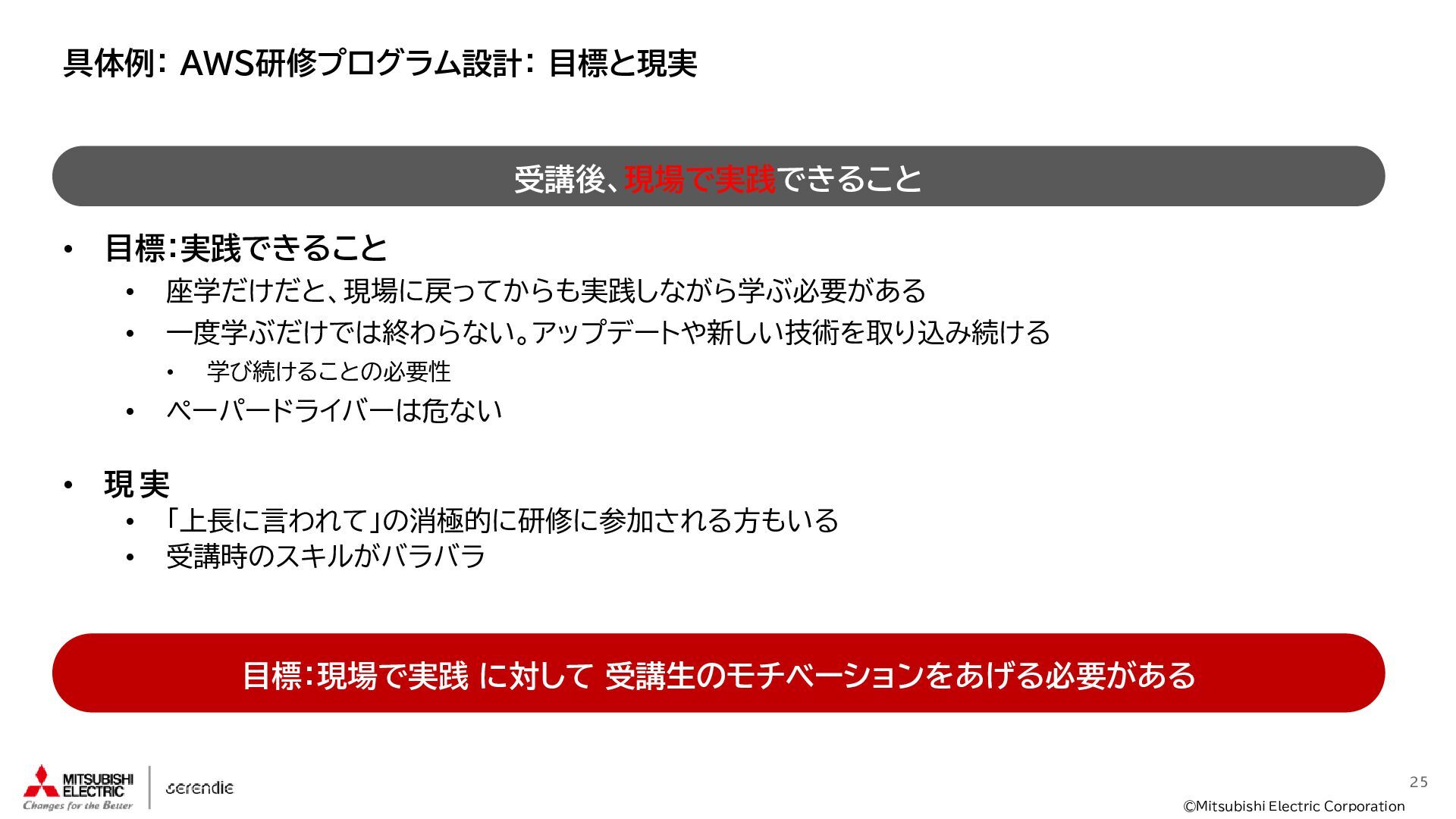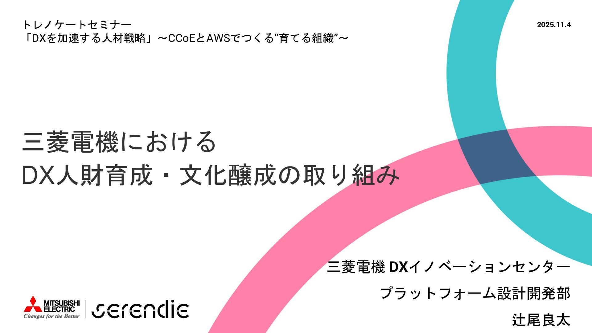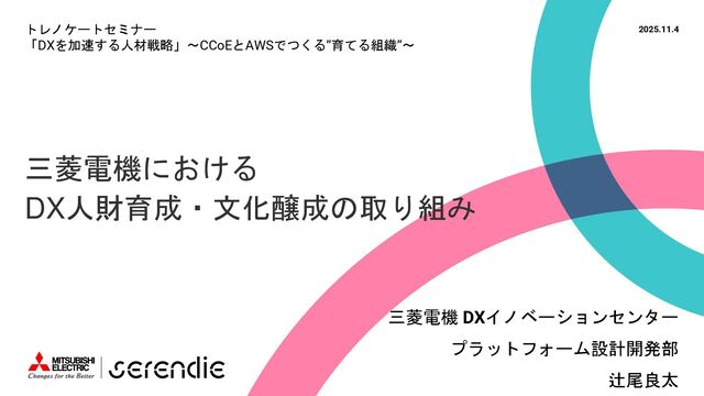 事 • 2012年 入社 • R&D部門で 組み込みH/W, S/Wやサーバインフラなどに携わる • 2023年~ • Serendie 技術基盤 設計・開発・運用 • DX人財育成 AWS関連講座の設計・実行 ス キ ル • Japan AWS Top Engineers 2025 • Japan All AWS Certifications Engineers 2024-2025 • IPA (SW(旧)、NW、DB、ES、SC(旧)) • 認定スクラムマスター、レジスタードプロダクトオーナー • 第一級陸上無線技術士 趣 味 • 子どもと遊ぶ、 妻とコーヒーを飲む • フィットネス 自己紹介:辻尾良太 2