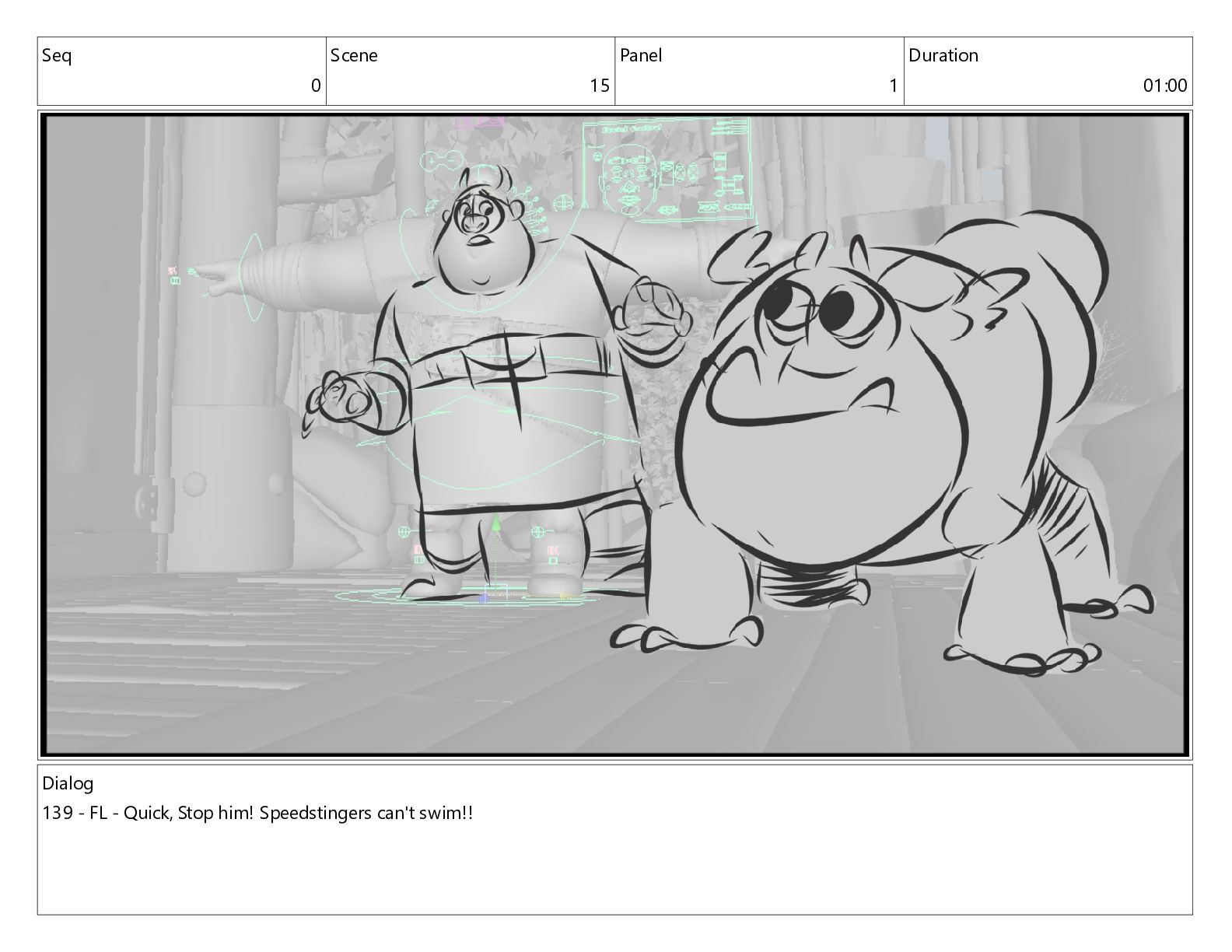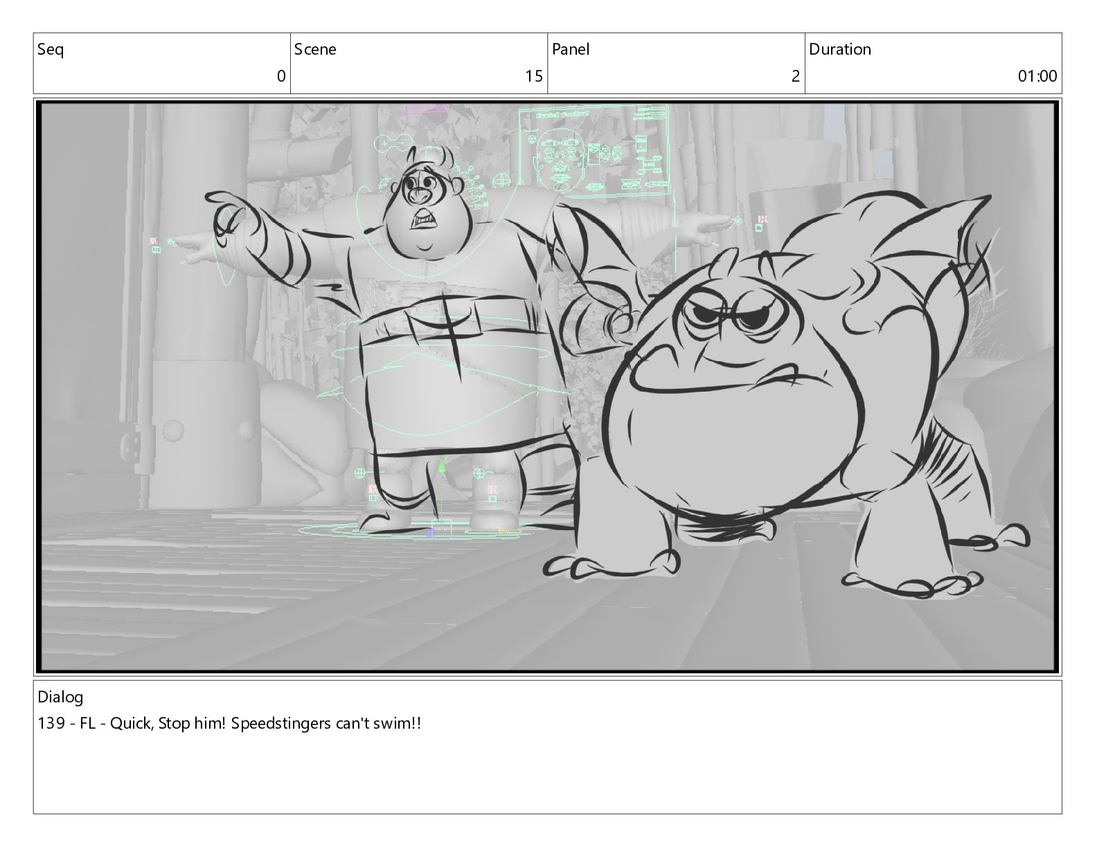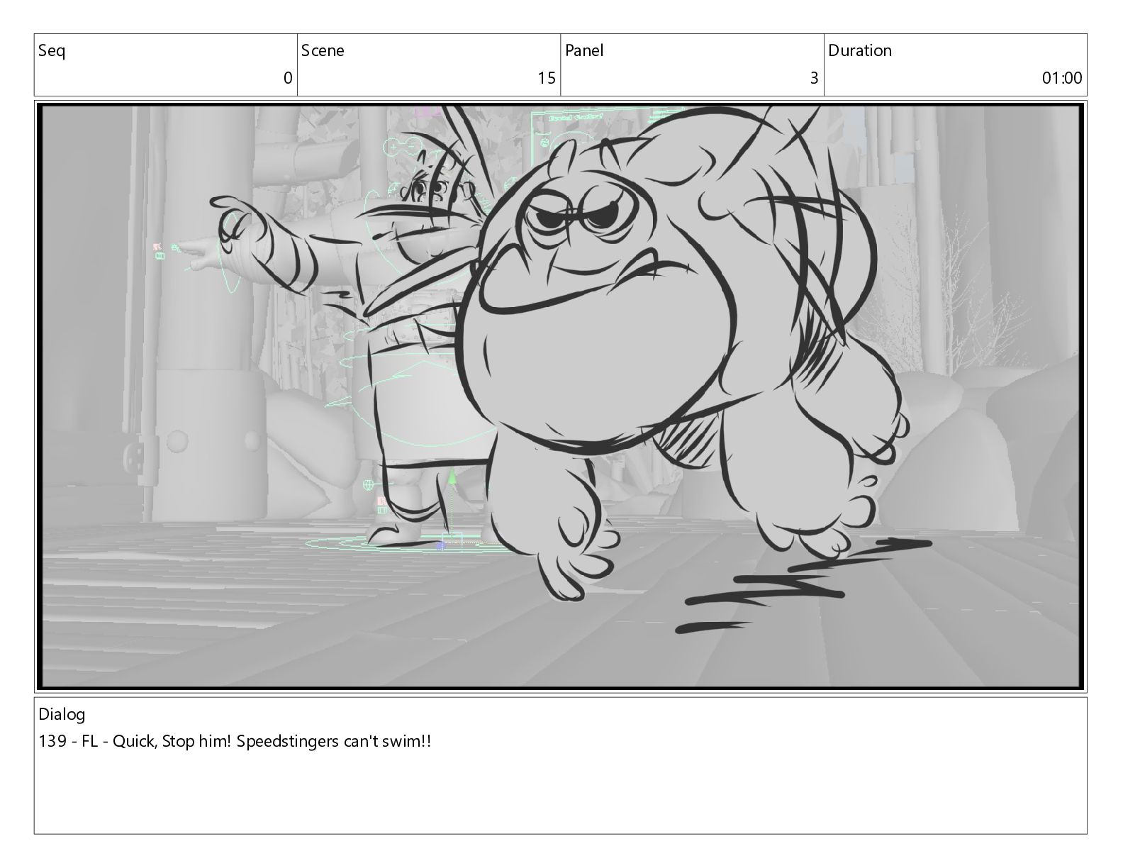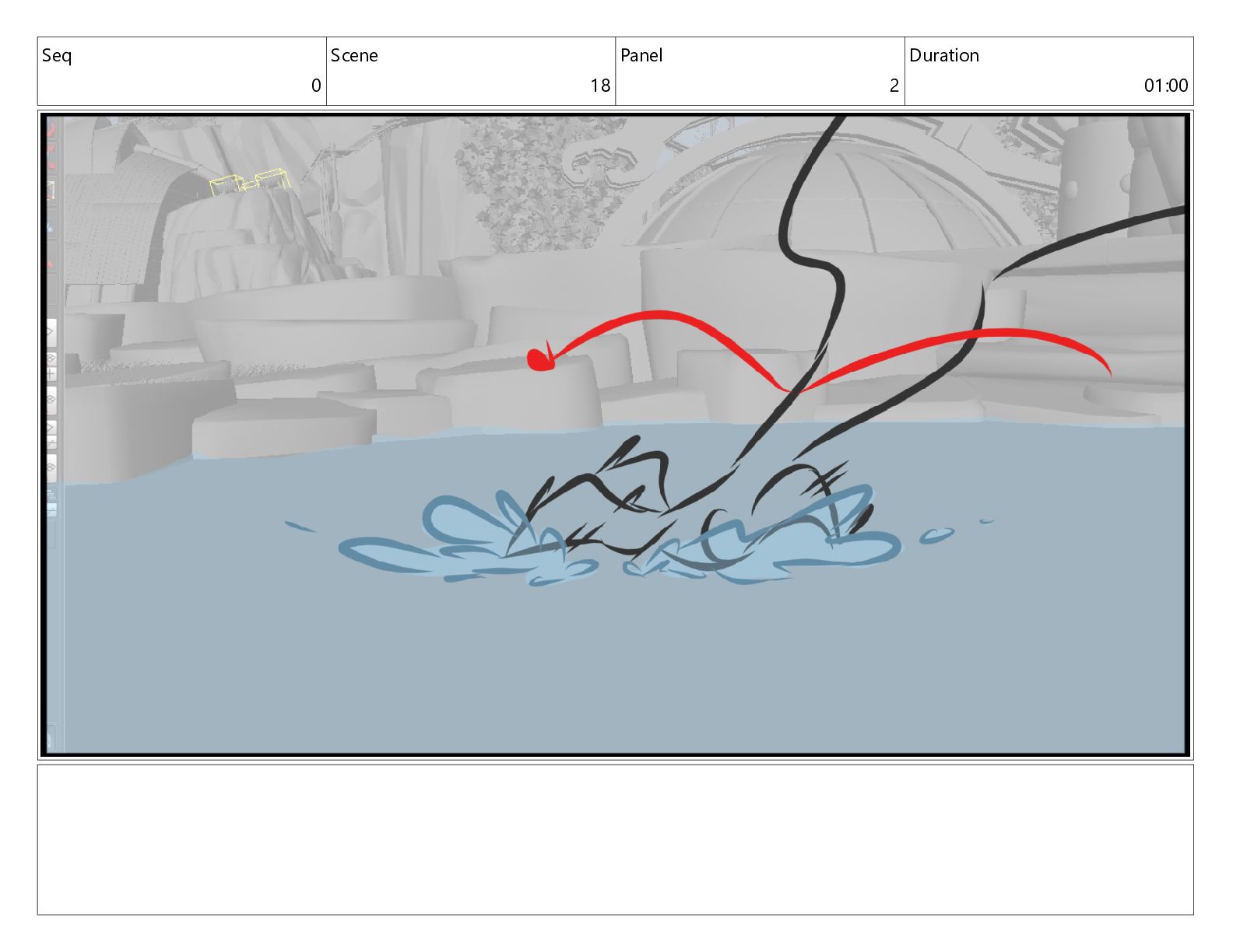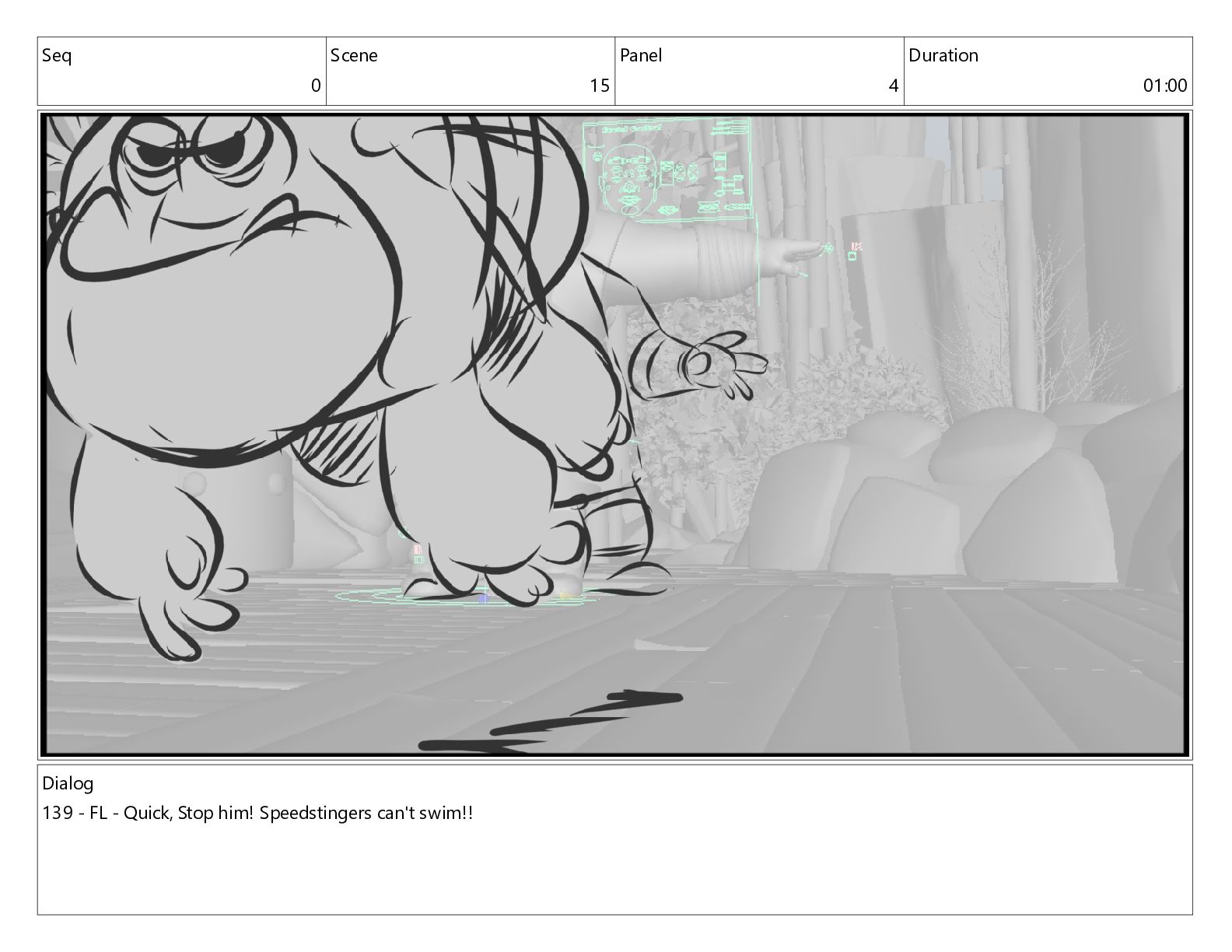 Rough storyboards for a sequence of the episode "The Next Big Sting", revealing the SpeedStinger can run across water.