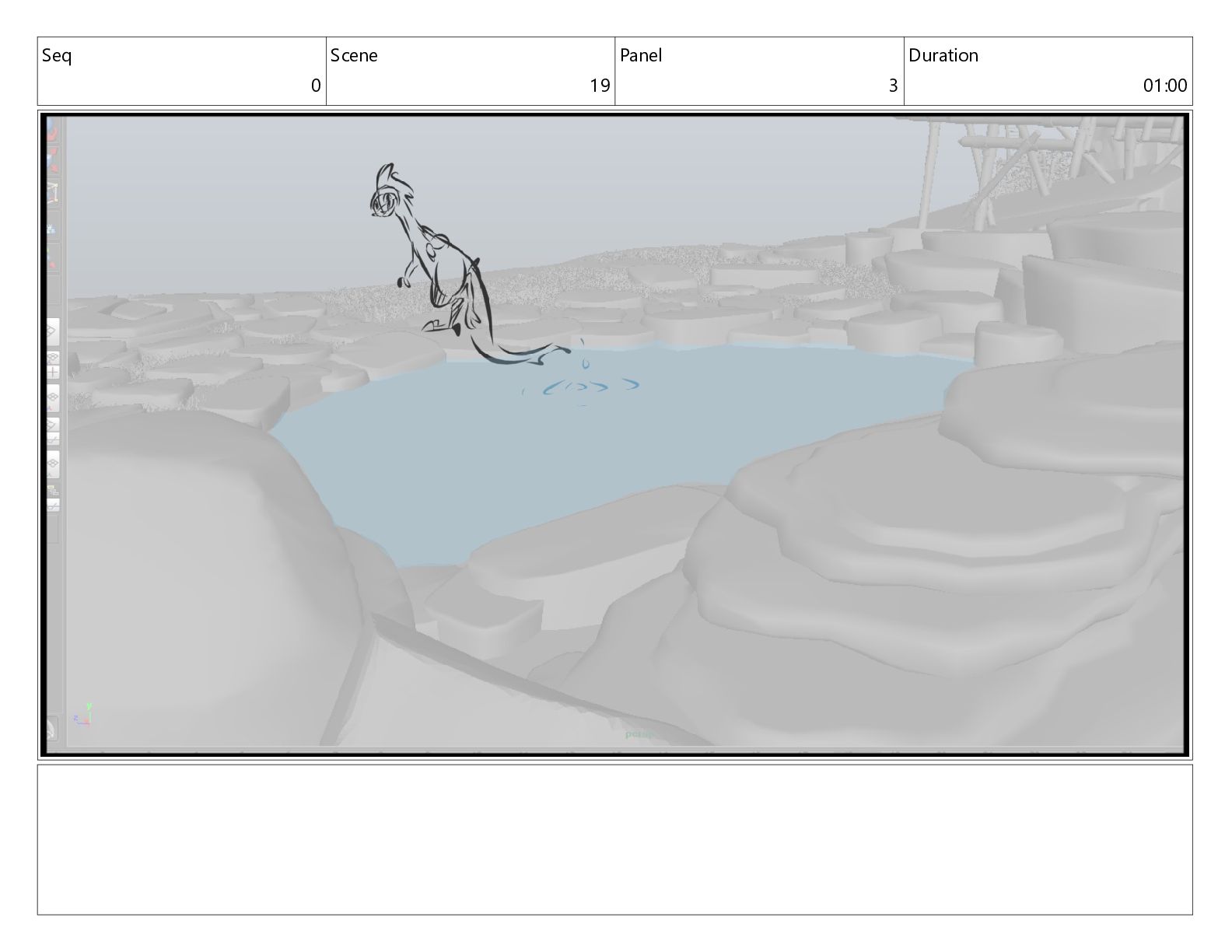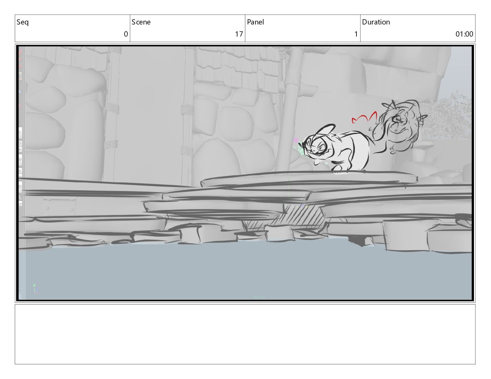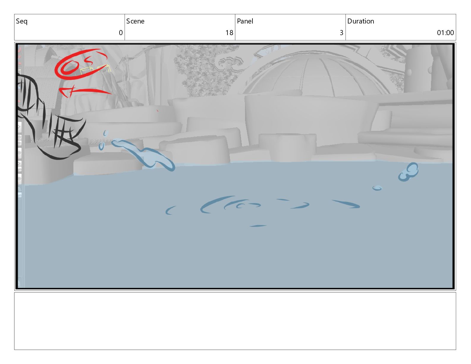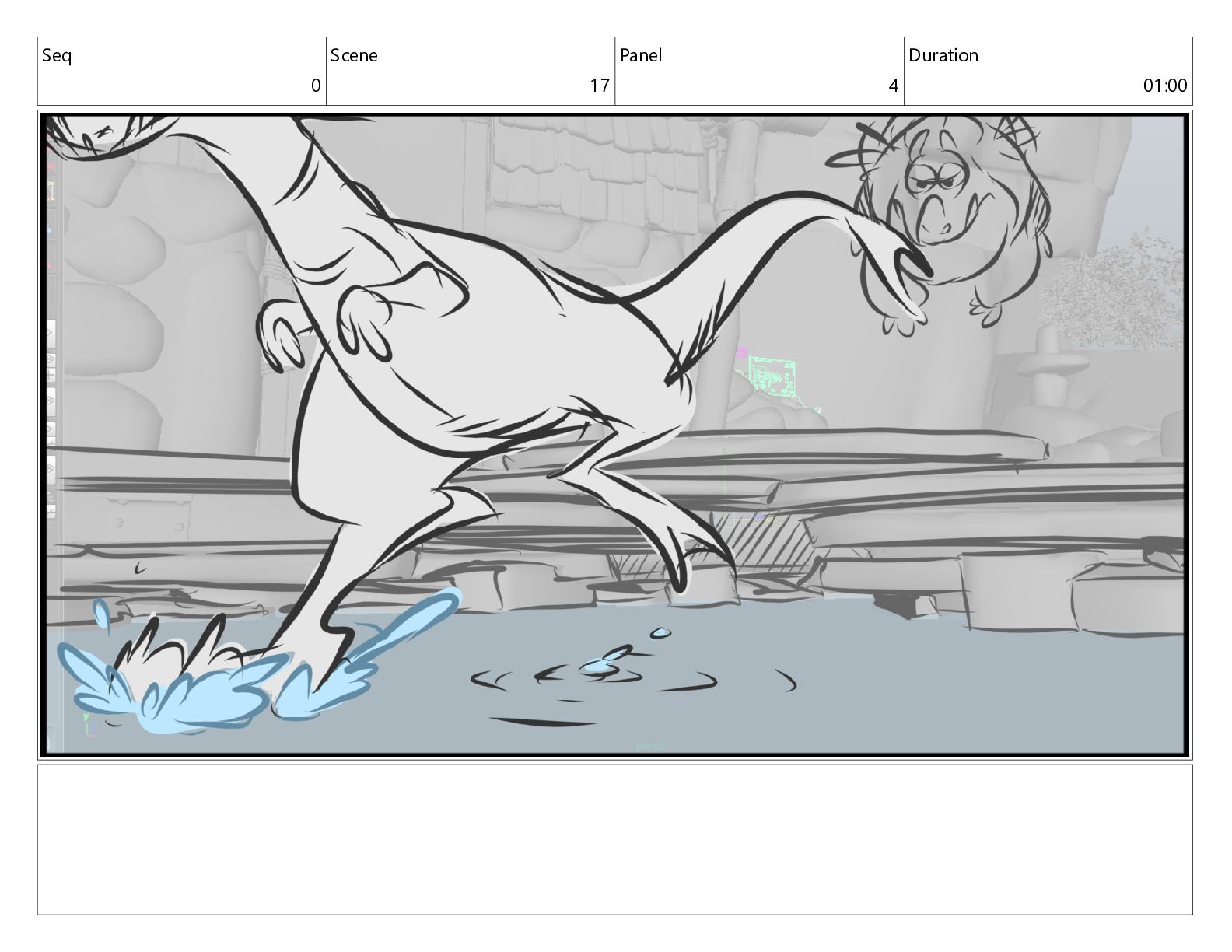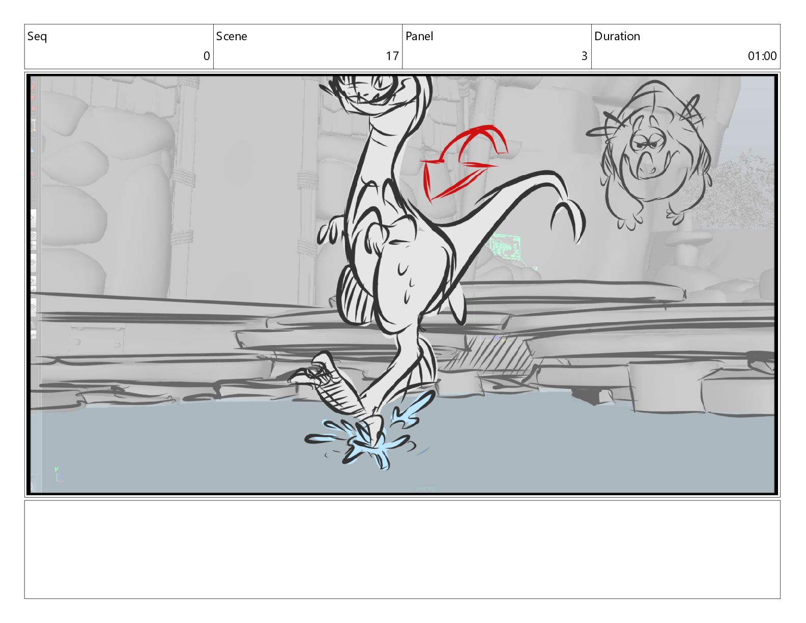 Rough storyboards for a sequence of the episode "The Next Big Sting", revealing the SpeedStinger can run across water.