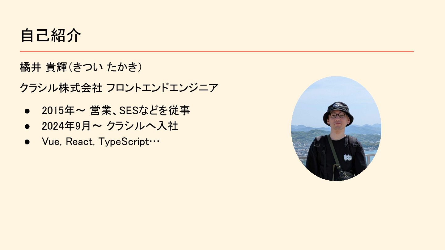 自己紹介 橘井 貴輝(きつい たかき) クラシル株式会社 フロントエンドエンジニア • 2015年〜 営業、SESなどを従事 •