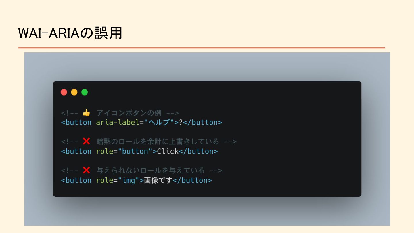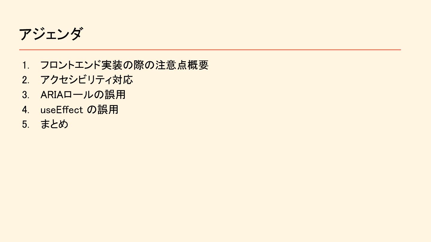 アジェンダ 1. フロントエンド実装の際の注意点概要 2. アクセシビリティ対応 3. ARIAロールの誤用 4. useEffect の誤用