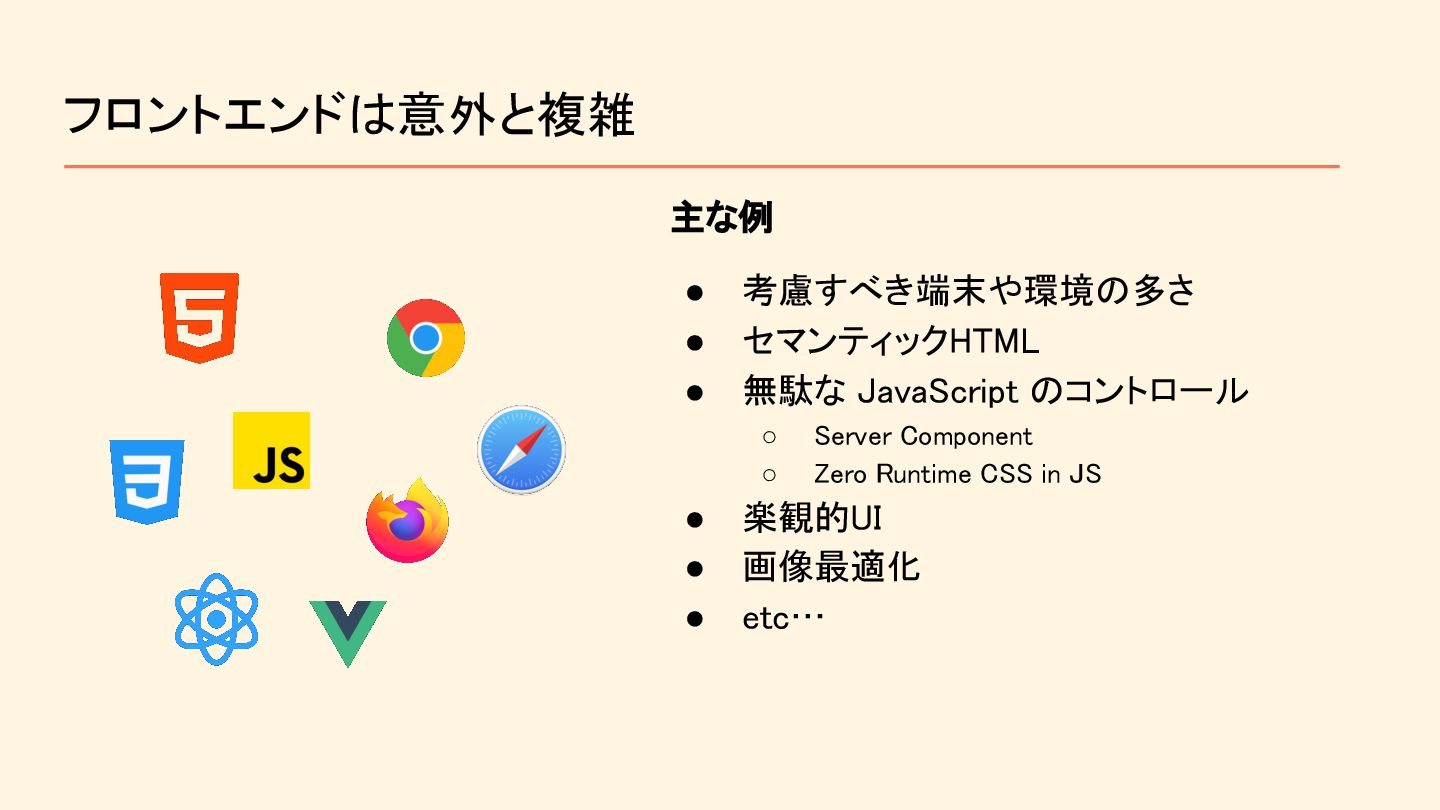 フロントエンドは意外と複雑 主な例 • 考慮すべき端末や環境の多さ • セマンティックHTML • 無駄な JavaScript のコントロール