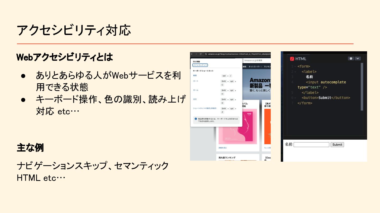 主な例 ナビゲーションスキップ、セマンティック HTML etc…